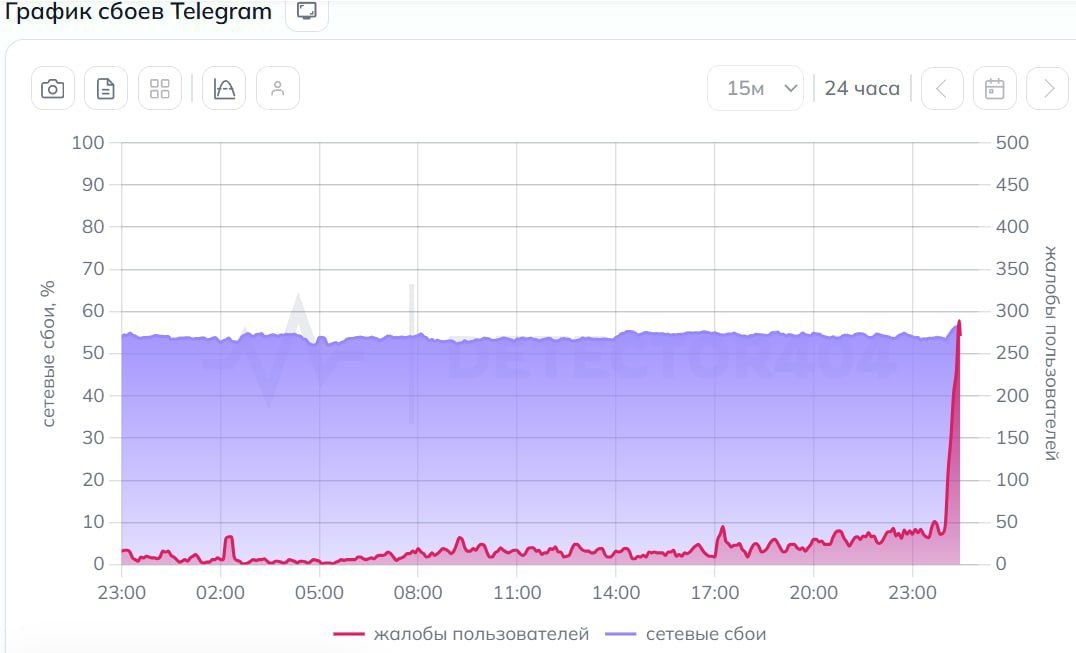 Число жалоб на работу Telegram в России с начала суток резко выросло, следует из данных Downdetector