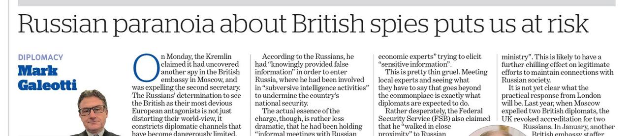 Паранойей он называет высылку очередного британского дипломата. При этом он цитирует наши объяснения, среди которых были и встречи этого шпиона с нашими экспертами. То есть Галеотти утверждает, что мы обвинили дипломата в выполнении им своих профессиональных обязанностей.