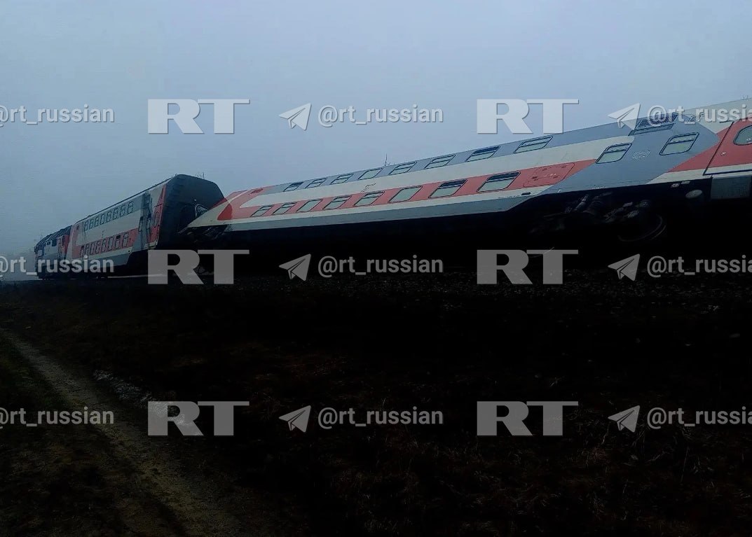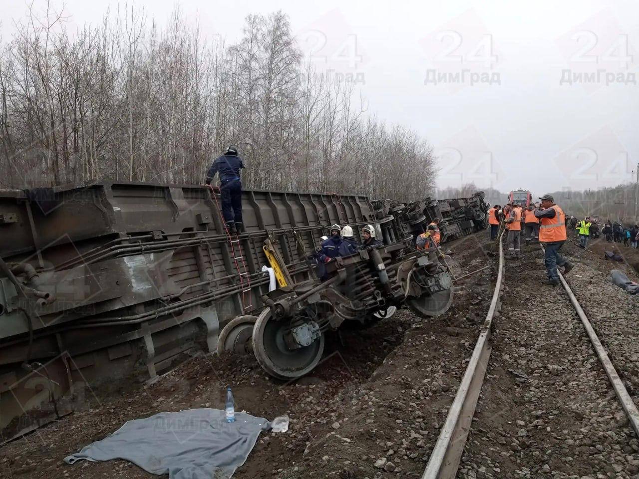 Спасательные работы на месте схода с рельсов поезда Москва — Челябинск. Из семи вагонов шесть опрокинулись, пострадали 22 человека. Погибших, предварительно, нет.