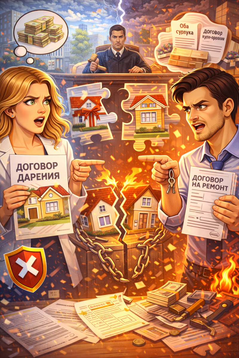 Иногда появляются ситуации, когда дарение формально, а на деле — это покупка. Например, родители могут продать квартиру супругам за символическую сумму, но оформить это как дар. Если в суде удастся доказать, что на самом деле имела место купля-продажа, ситуация может измениться. Суд восстанавливает факты сделки и может признать, что квартира была приобретена на совместные средства семьи.