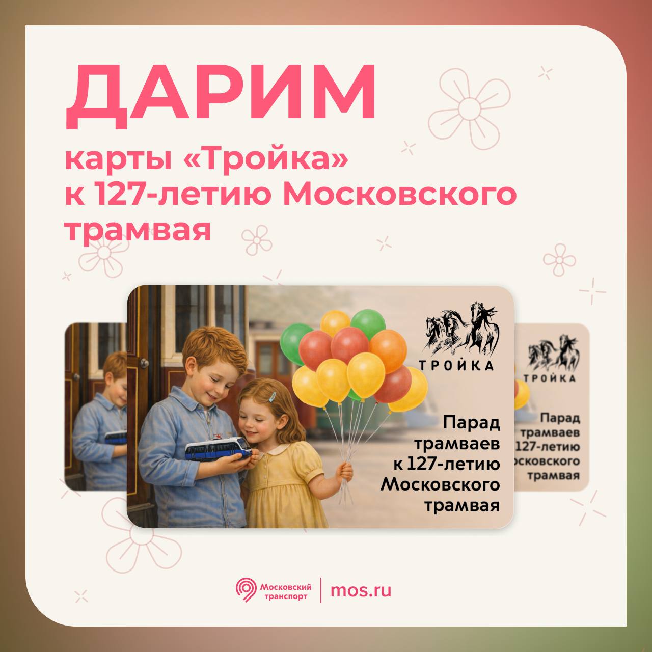 Поездки в трамваях — одни из самых романтичных, особенно весной. Вместе с Дептрансом Москвы дарим карты «Тройка» с уникальным дизайном в честь 127-летия этого вида столичного транспорта.