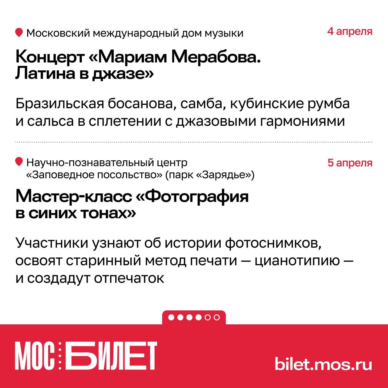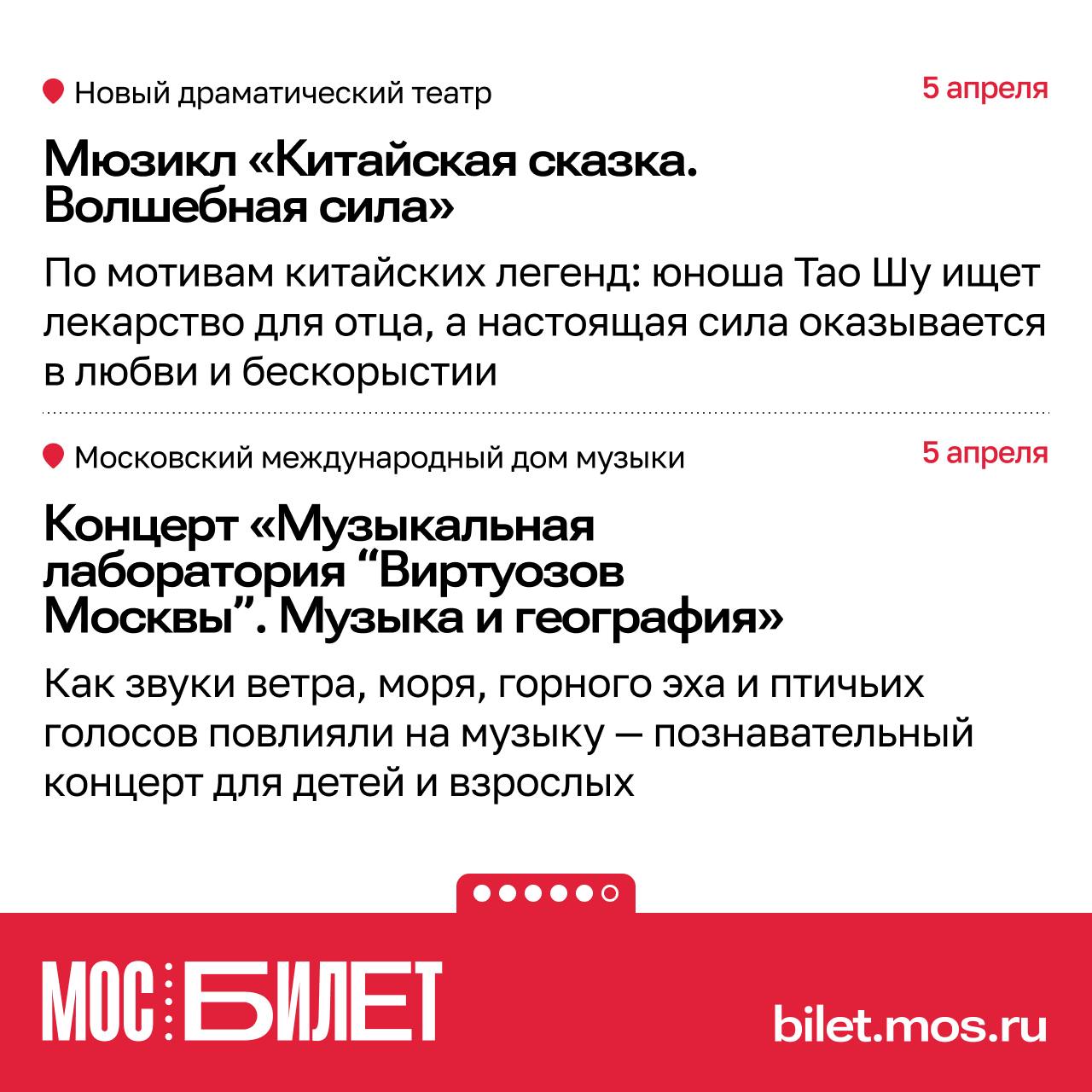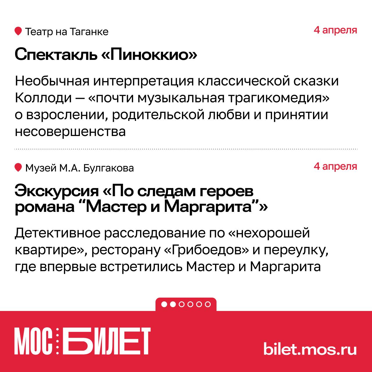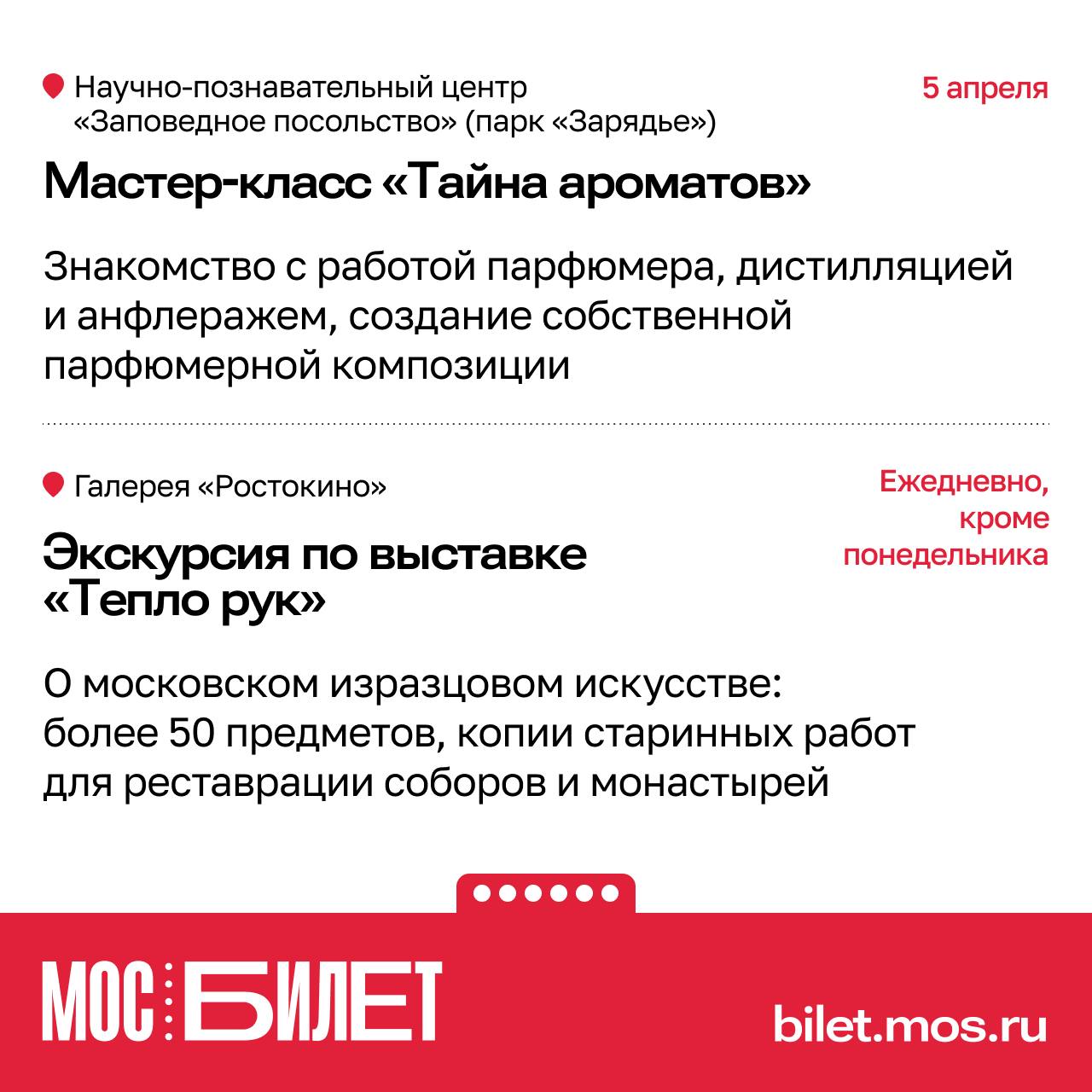 Сервис «Мосбилет» предлагает наполнить первые апрельские выходные яркими впечатлениями. В подборке — спектакли, экскурсии, концерты и мастер-классы на городских площадках.