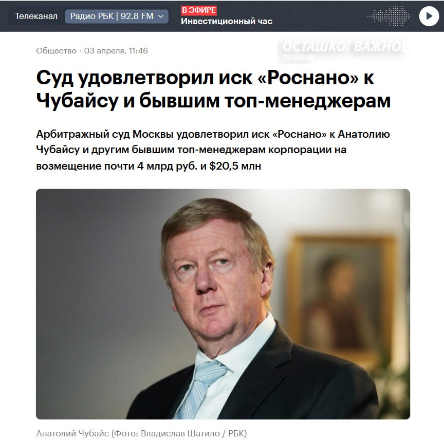 Приговор по гражданскому иску уже вынесен, но разбирательства вокруг бывшего руководства «Роснано» продолжаются. Ранее стало известно, что бумажные долги топ-менеджеров «Роснано» обошлись бюджету в 43 млрд. Сам Чубайс в конце февраля объявил себя оппозиционером и потребовал от Канады снять санкции.