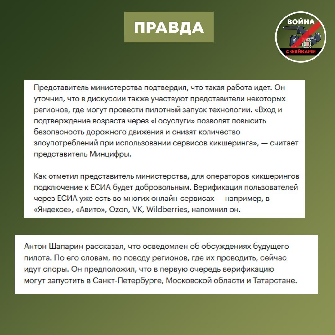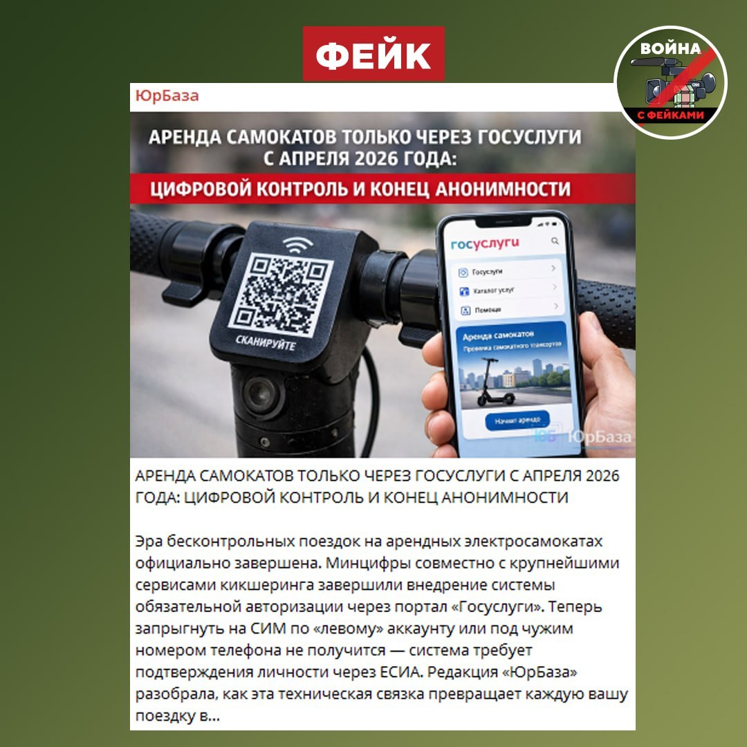 Фейк: Арендовать самокат в России можно будет только с помощью «Госуслуг». Тотальный контроль и конец цифровой анонимности предрекает ряд телеграм-каналов.