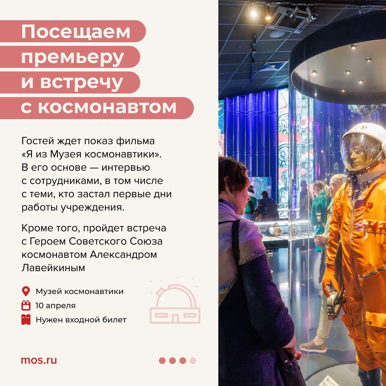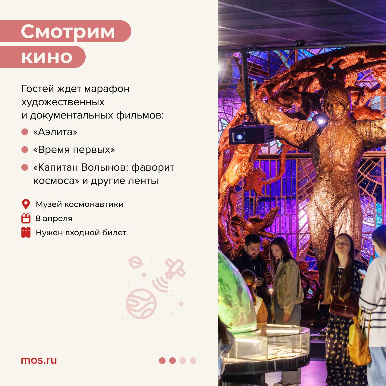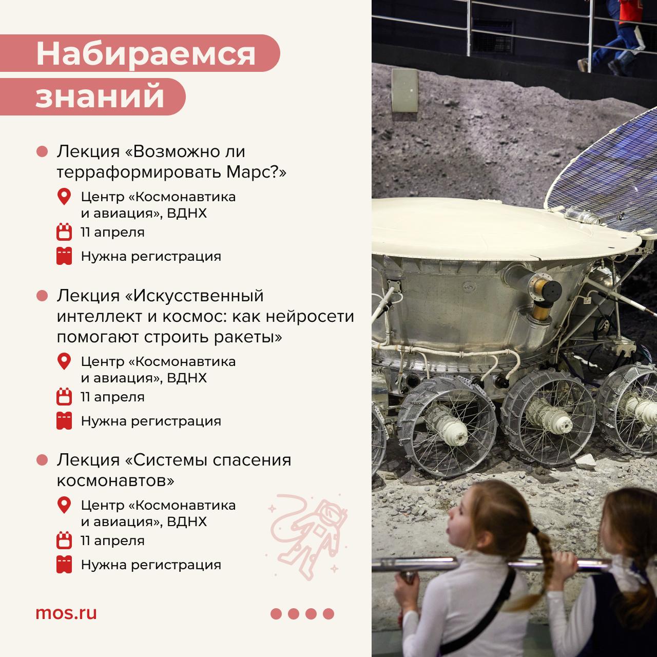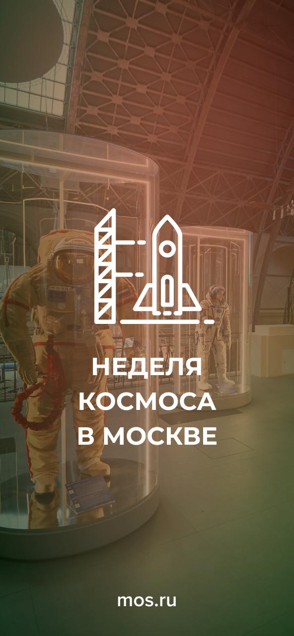 Сегодня в Москве начинается Неделя космоса! До 12 апреля в городе пройдут различные выставки, экскурсии, лекции, кинопоказы, а также множество других мероприятий. На некоторые из них потребуется регистрация или билет. Подробности — в наших карточках.