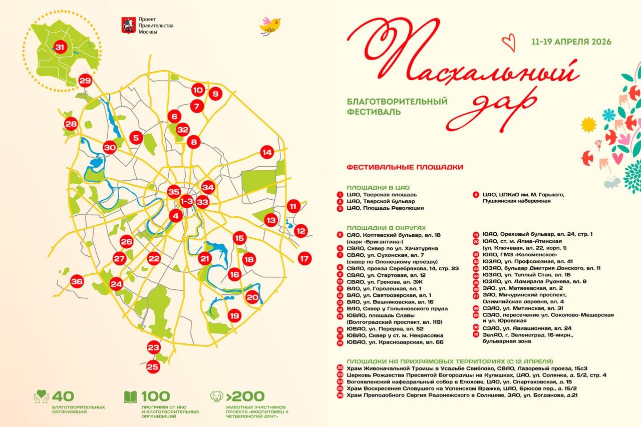 С 11 по 19 апреля на 31 площадке города — в парках, скверах и у пяти православных храмов — откроются «Домики добра» проекта «Москва помогает». Каждый сможет принести подарки для участников СВО и детей из новых регионов.
