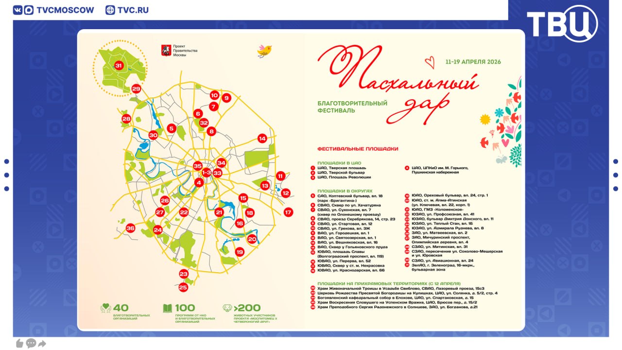 С 11 по 19 апреля на фестивальных площадках будут работать «Домики добра» проекта «Москва помогает»: в будние дни — с 11:00 до 21:00, а в выходные — с 10:00 до 21:00.