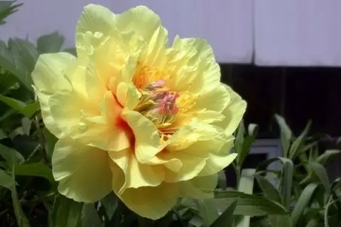 Этот многолетник отличается среднерослым ростом, достигая 80-90 см в высоту. Кусты формируют прочные стебли светло-зеленого цвета, которые способны выдерживать вес крупноцветковых соцветий. Листва пионов имеет насыщенный тёмно-зелёный оттенок, а цветоносы и корневая система хорошо развиты. Цветки являются полумахровыми, с волнистыми лепестками, которые аккуратно прилегают друг к другу. Основной цвет – насыщенно-жёлтый, а у основания лепестков заметны яркие алые пятна. Ароматические качества цветков просто потрясающие.