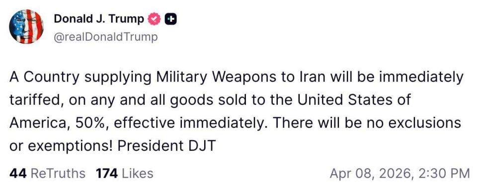 США будут незамедлительно вводить 50-процентные пошлины против стран, поставляющих оружие Ирану, угрожает Трамп.