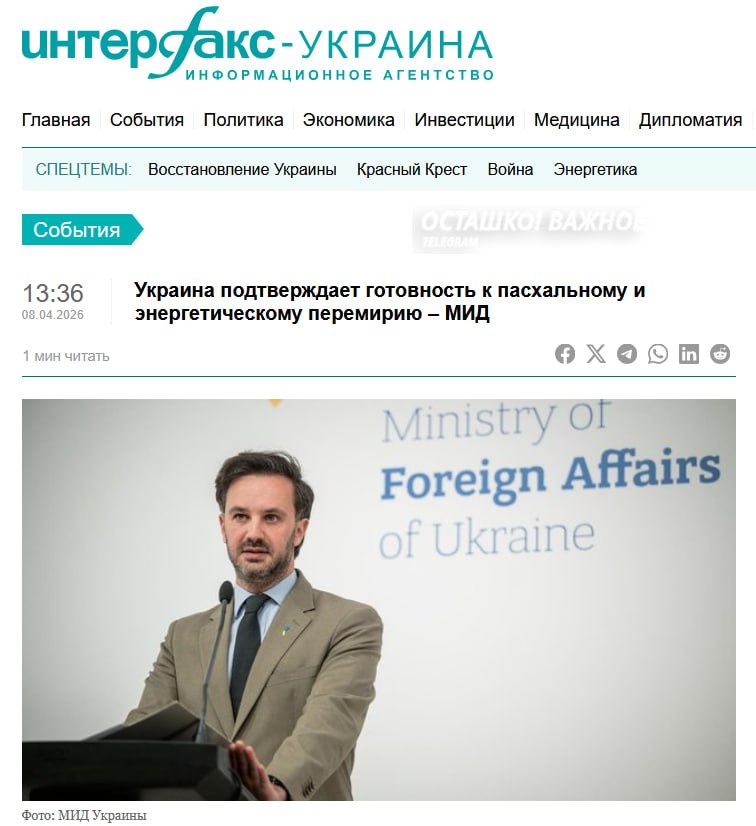 МИД Украины официально подтвердил готовность к пасхальному и энергетическому перемирию — но при одном условии: сначала прекращает удары Россия.