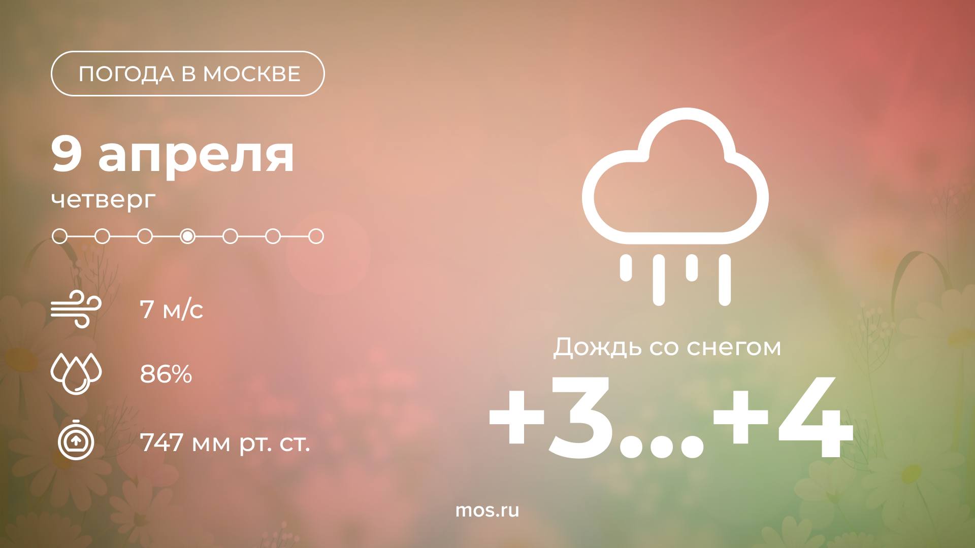 Доброе утро! Сегодня в Москве будет пасмурно погода, в течение дня будет идти дождь со снегом. Столбики термометров покажут от +3 до +4 °С.