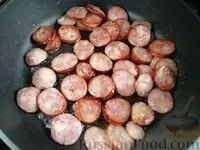 3. Ввести консервированную фасоль и нарезанные помидоры. Посыпать паприкой, солью и перцем. Перемешать все ингредиенты.