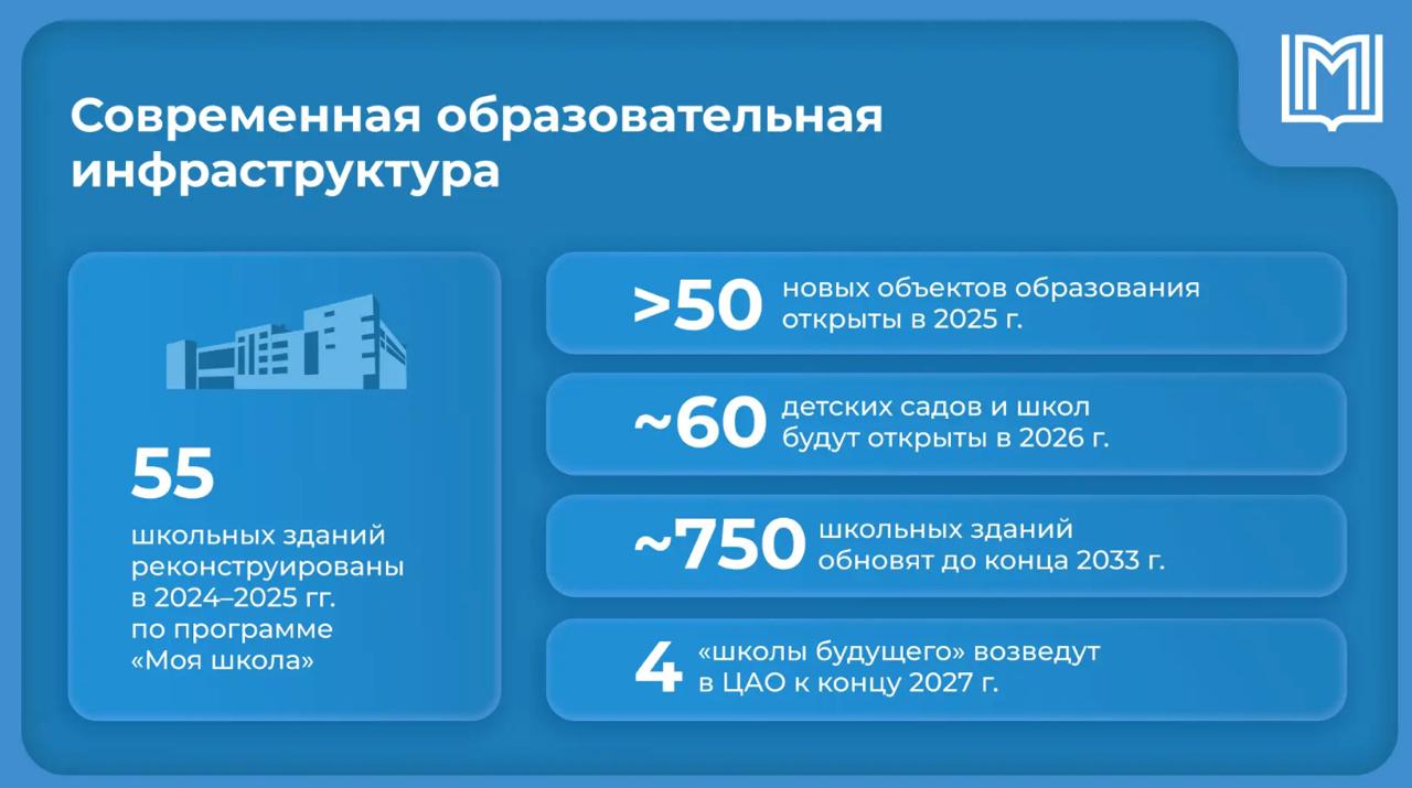 Город системно обновляет школы. За 2024–2025 годы по программе «Моя школа» полностью реконструировали 55 зданий – сегодня это современные и удобные пространства для учёбы и творчества. Параллельно идёт строительство новых объектов. В прошлом году ввели более 50 школ и детских садов, и темпы сохраняются.
