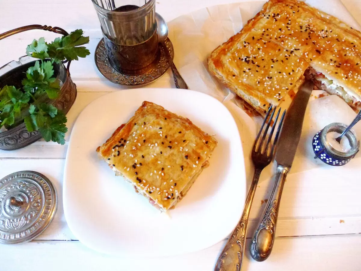 Сейчас фастфуд стал привычной частью жизни, однако домашнее питание всегда будет вне конкуренции. Пирог на основе слоёного теста с сочной мясной начинкой даст возможность прикоснуться к знакомым вкусам в новом формате. Это блюдо обязательно понравится всей семье, особенно детям, которые, возможно, на время забудут о чизбургерах из магазинов.