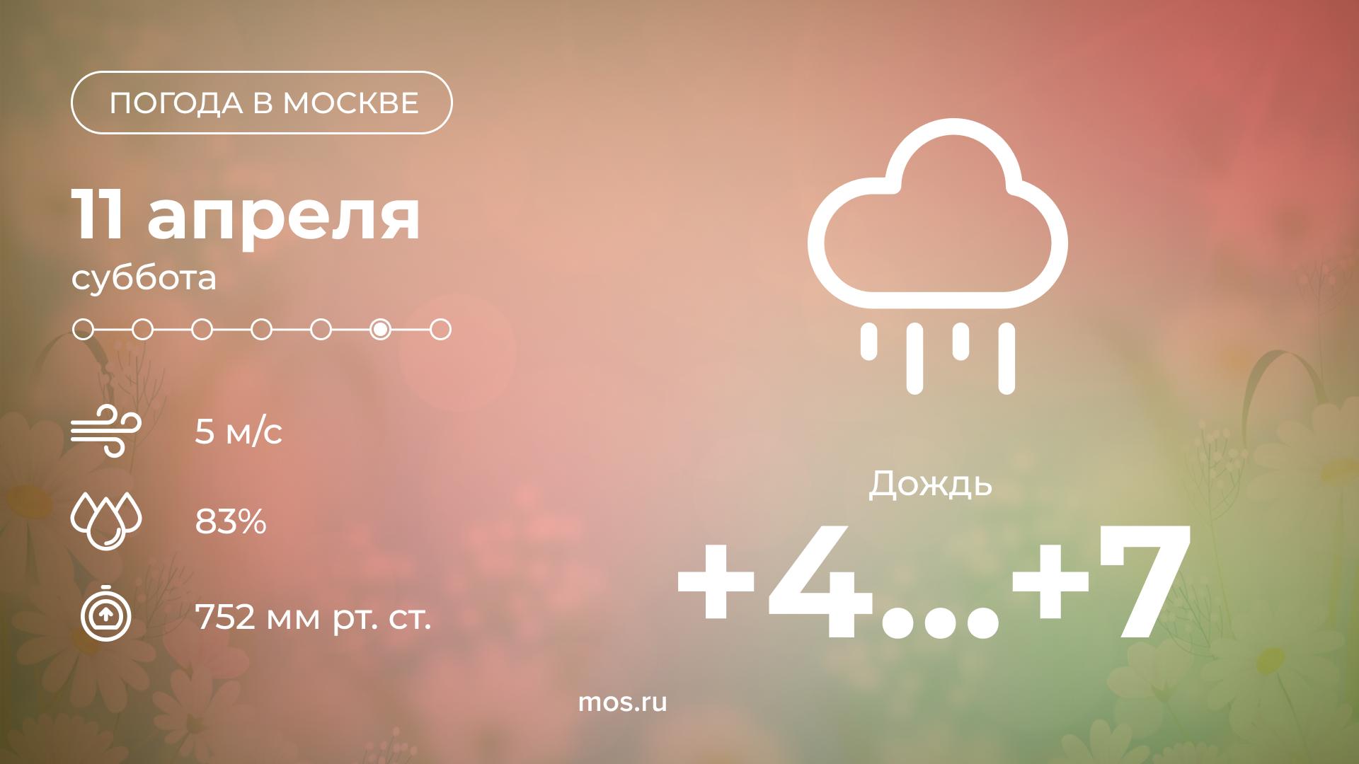 Доброе утро! Сегодня утром и днем в Москве ожидается дождь. Столбики термометров покажут от +4 до +7 °С. Не забудьте взять с собой зонтик!
