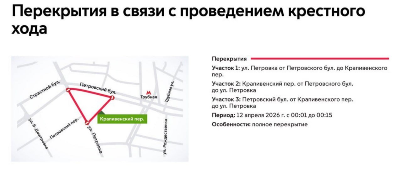 Сегодня ночью с 00:01 до 00:15 водителям лучше объезжать:ПетровкуКрапивенский переулокПетровский бульварДвижение закроют на коротких участках в районе Высоко-Петровского монастыря.