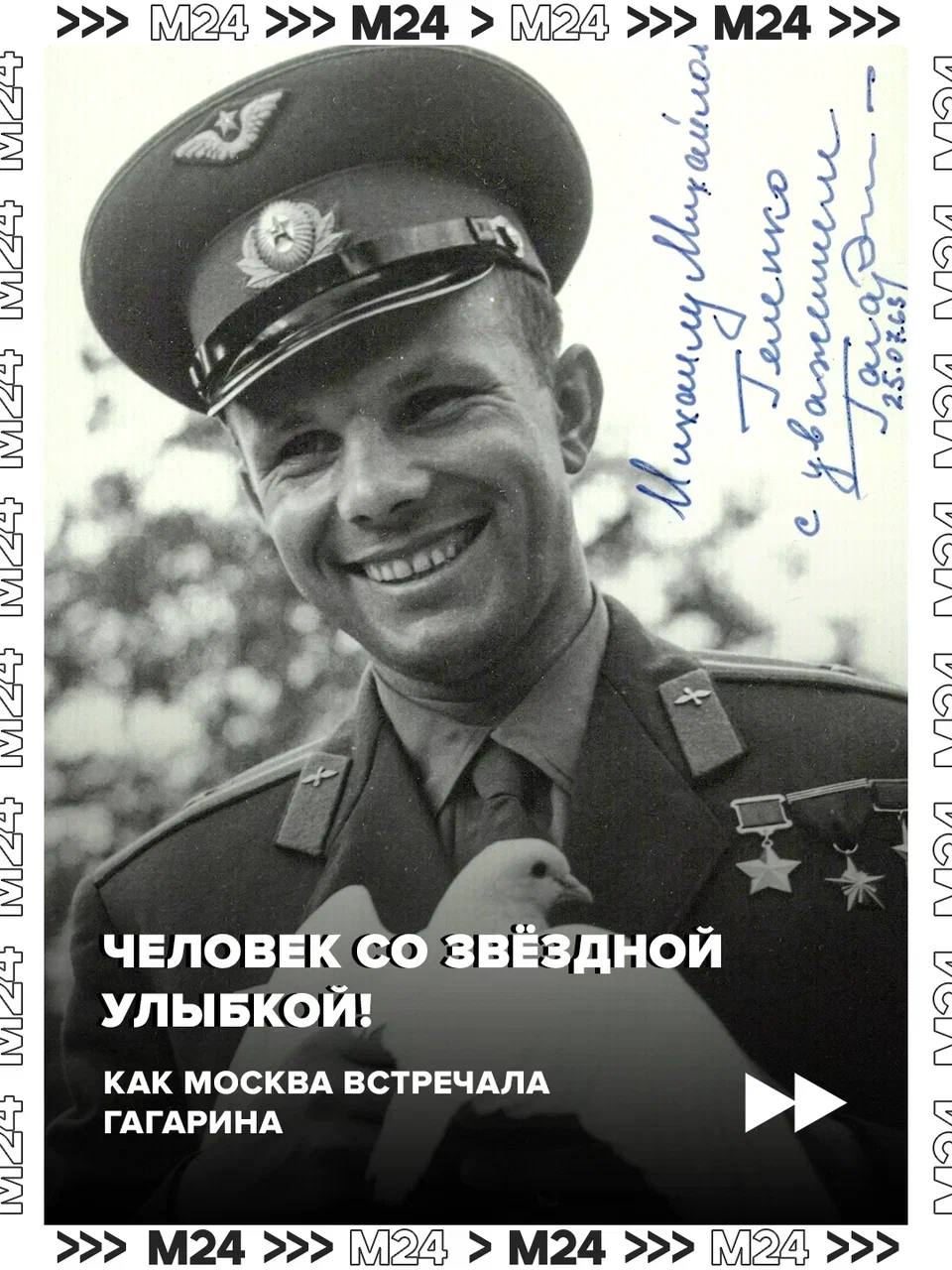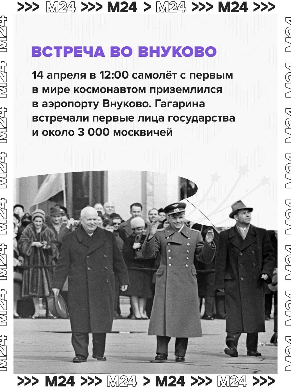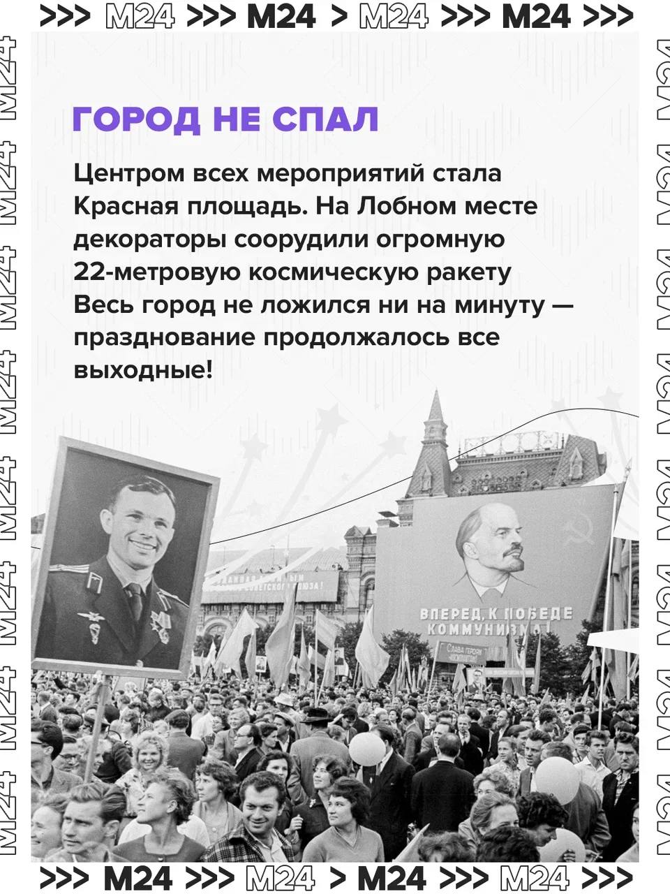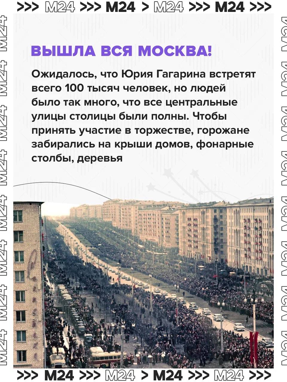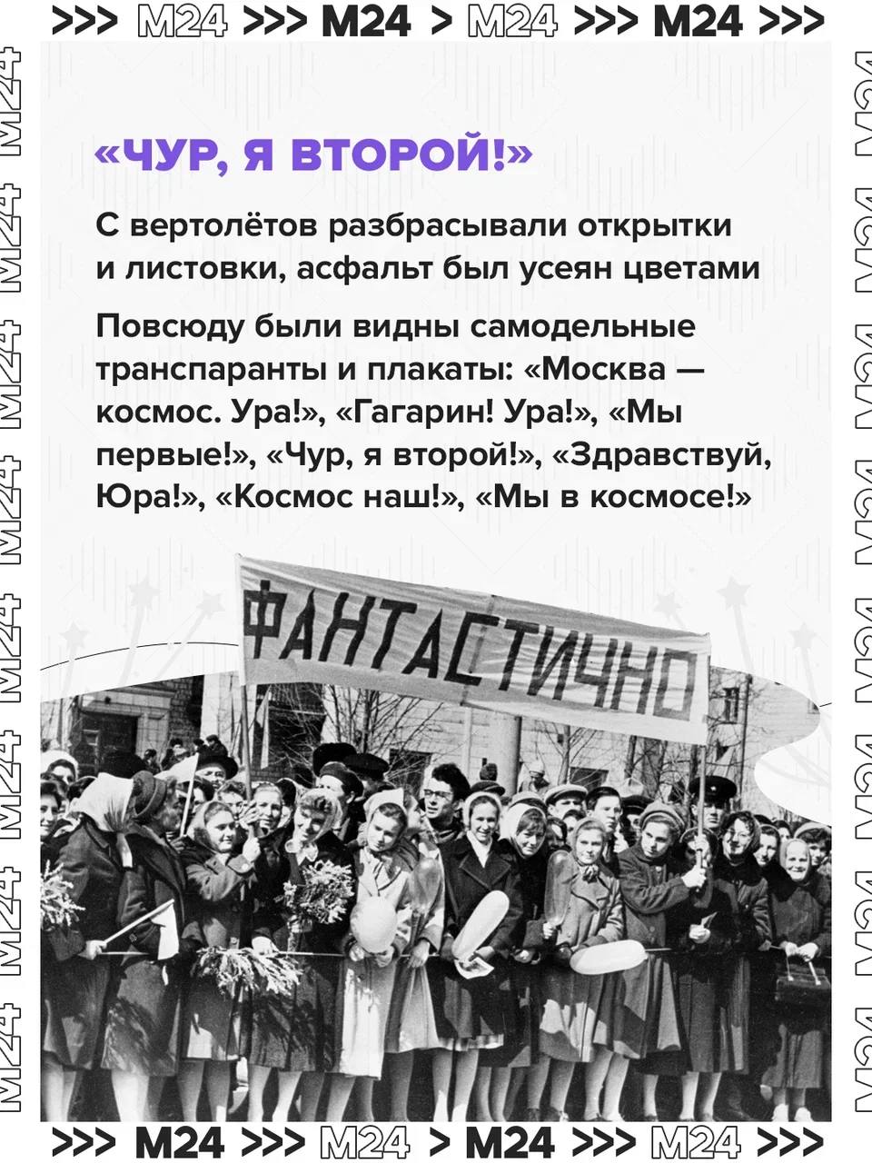 С околоземной орбиты — в сердце столицы: через два дня после мирового подвига в московском аэропорту приземлился самолёт с Юрием Гагариным. Здесь, на улицах и проспектах, его встречали толпы людей.