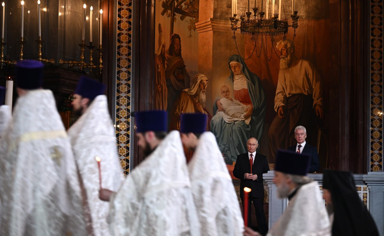 В ночь на 12 апреля Президент России В.В.Путин вместе с мэром Москвы С.С.Собяниным присутствовал на пасхальном богослужении в храме Христа Спасителя. Службу совершил Патриарх Московский и всея Руси Кирилл.