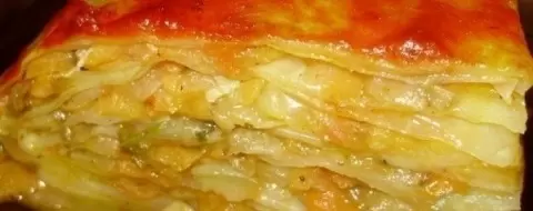 Теперь, когда капуста готова к запеканию, поверхность противня следует смазать маслом и слегка обжарить в духовке при 180°C. В завершение залить соусом, сделанным на основе сметаны, томатного пюре и мясного бульона, продолжая запекать, пока капуста не станет золотистой и нежной.