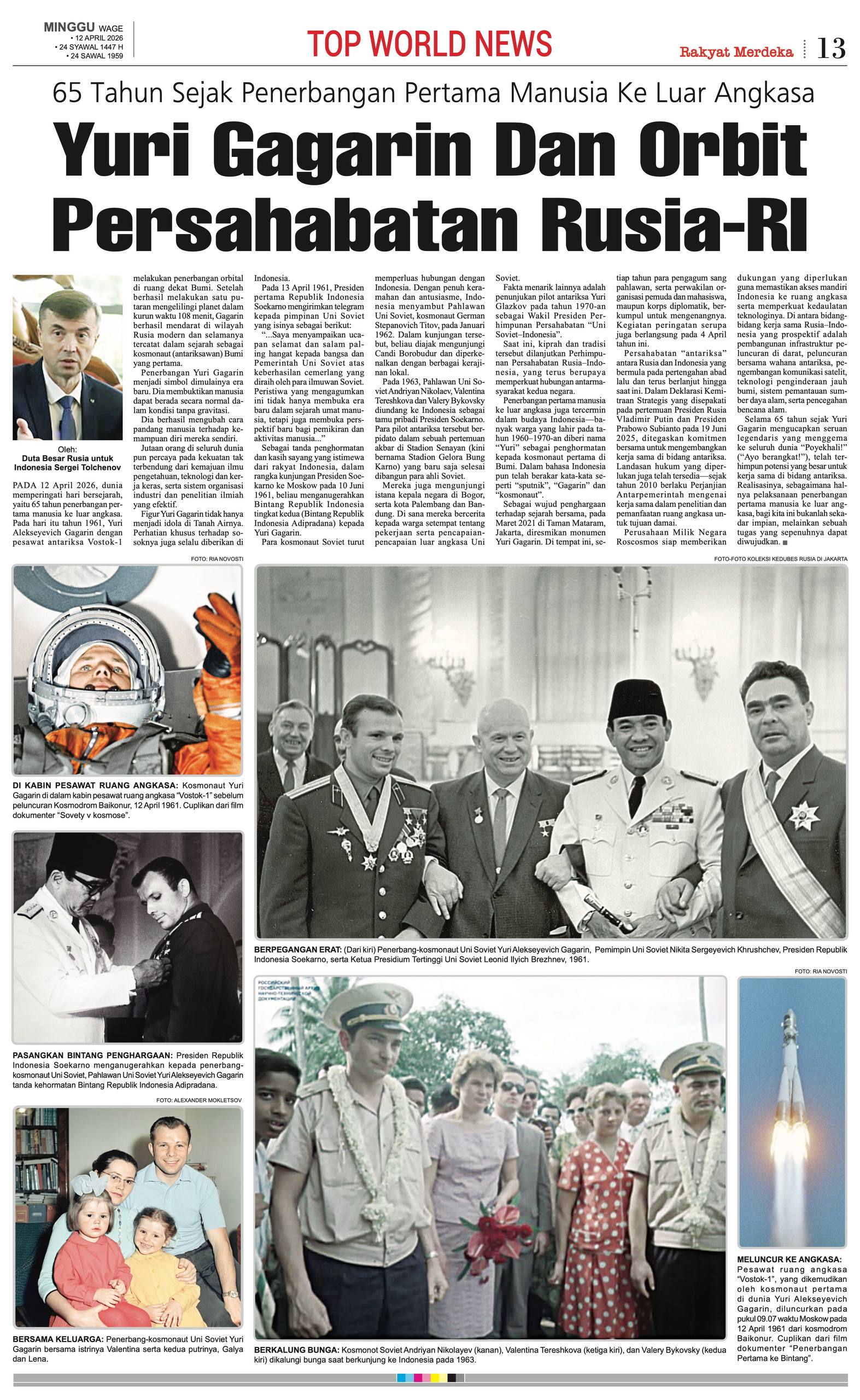 Статья Посла России в Индонезии С.Г.Толченова «65 лет первому полету человека в космос – Юрий Гагарин и орбиты российско-индонезийской дружбы» и тематическая фотовыставка по случаю Дня космонавтики в газете Rakyat Merdeka (12 апреля 2026 года)