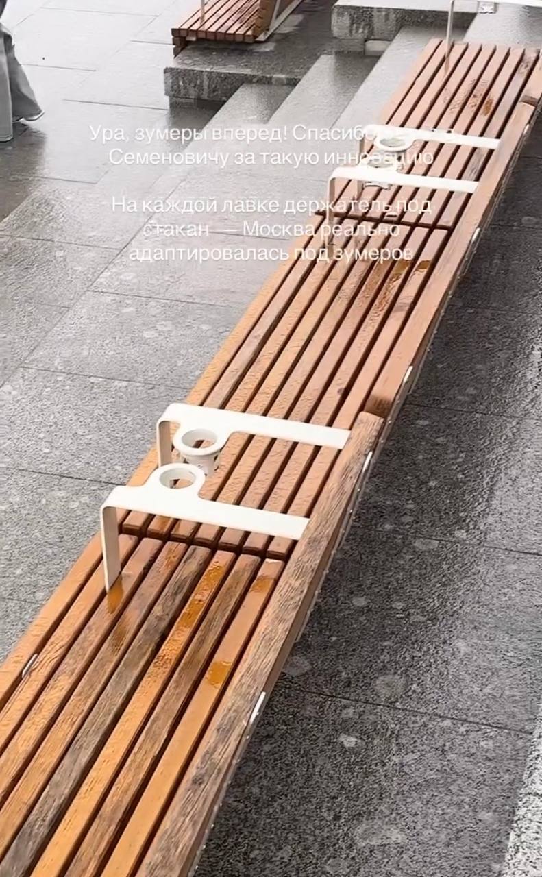 Зумеры в восторге от новых лавочек с подстаканниками на набережной в Парке Горького. Теперь нет проблемы, куда пристроить латте на овсяном.