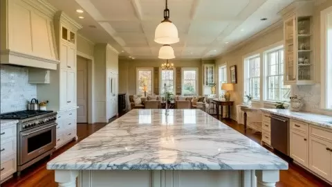 Часто в таких кухнях устанавливается массивный остров, который выполняет несколько функций: это не только рабочая поверхность, но и место для завтрака и хранения. Широкие проходы позволяют нескольким людям передвигаться, не мешая друг другу, а большая мойка у окна делает рутинные дела более приятными.