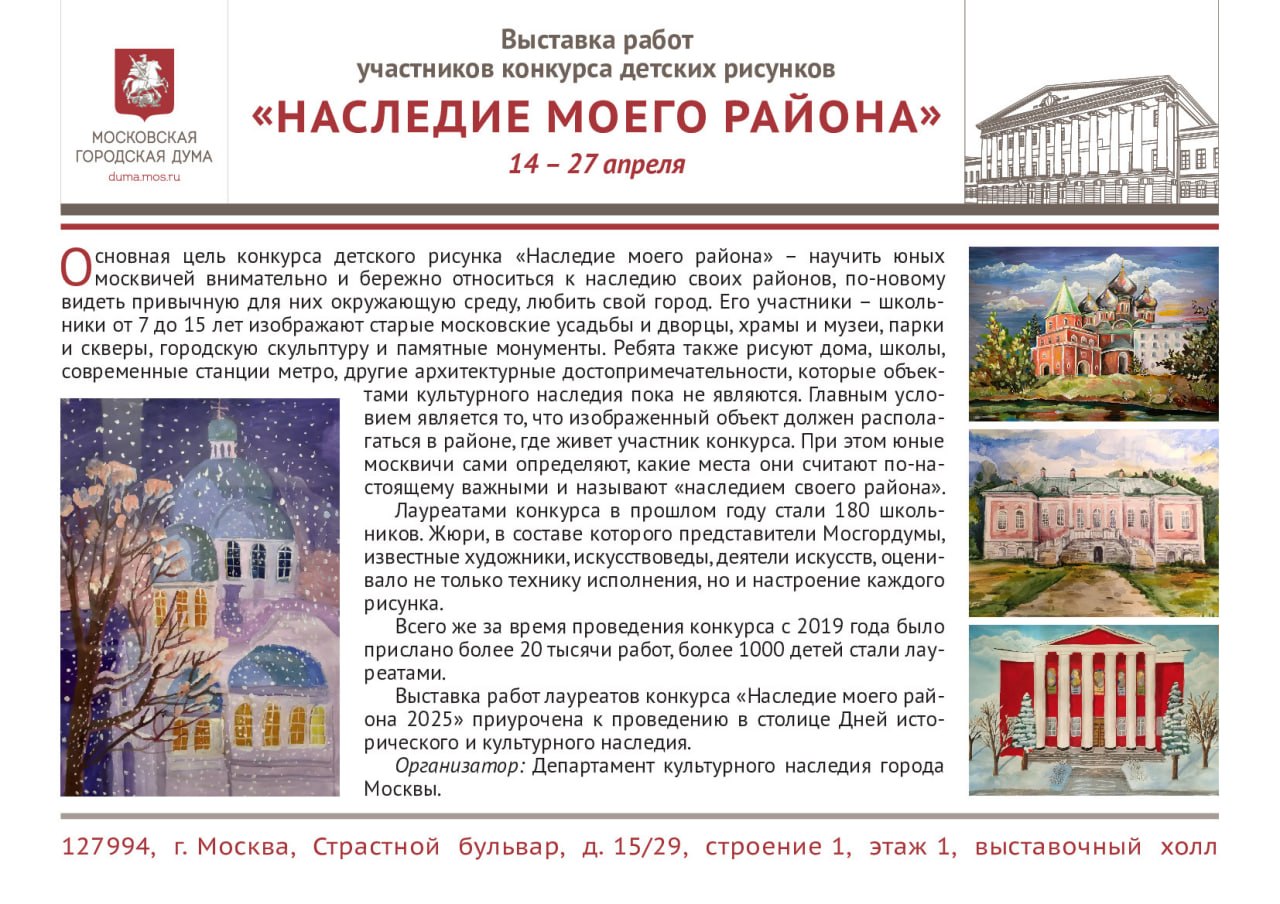 В Московской городской Думе откроется выставка победителей VII конкурса детского рисунка «Наследие моего района»