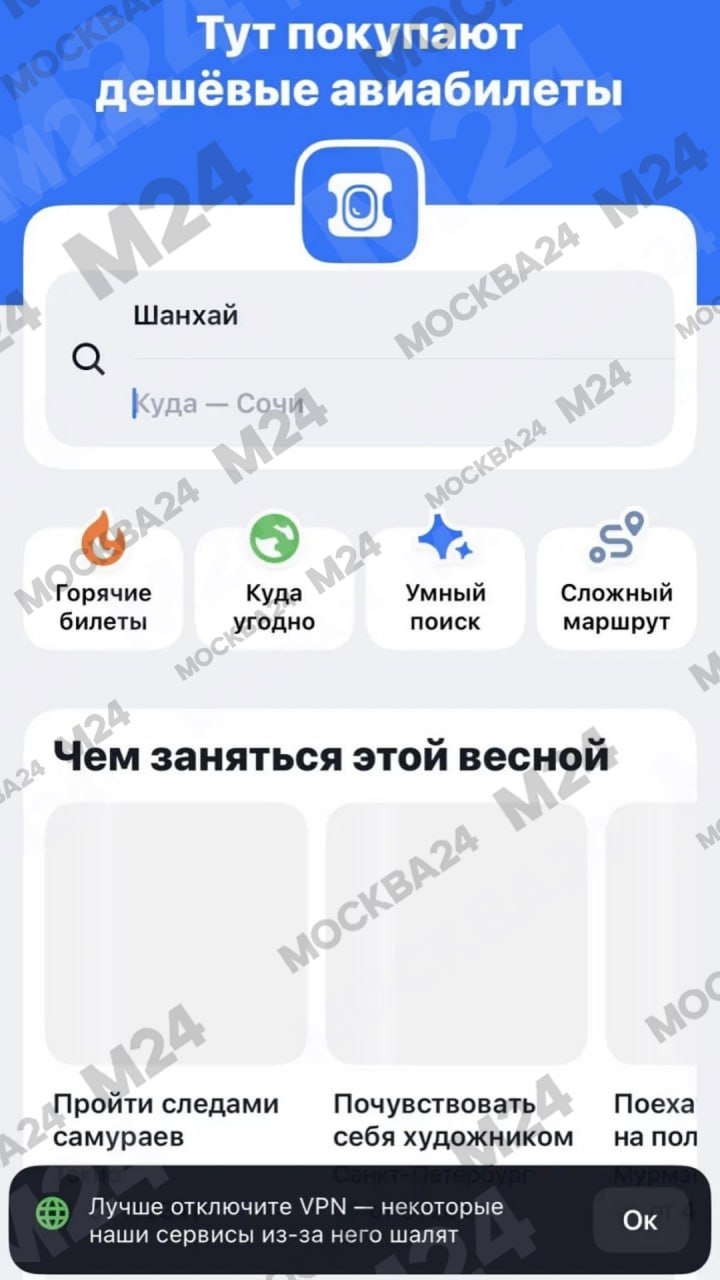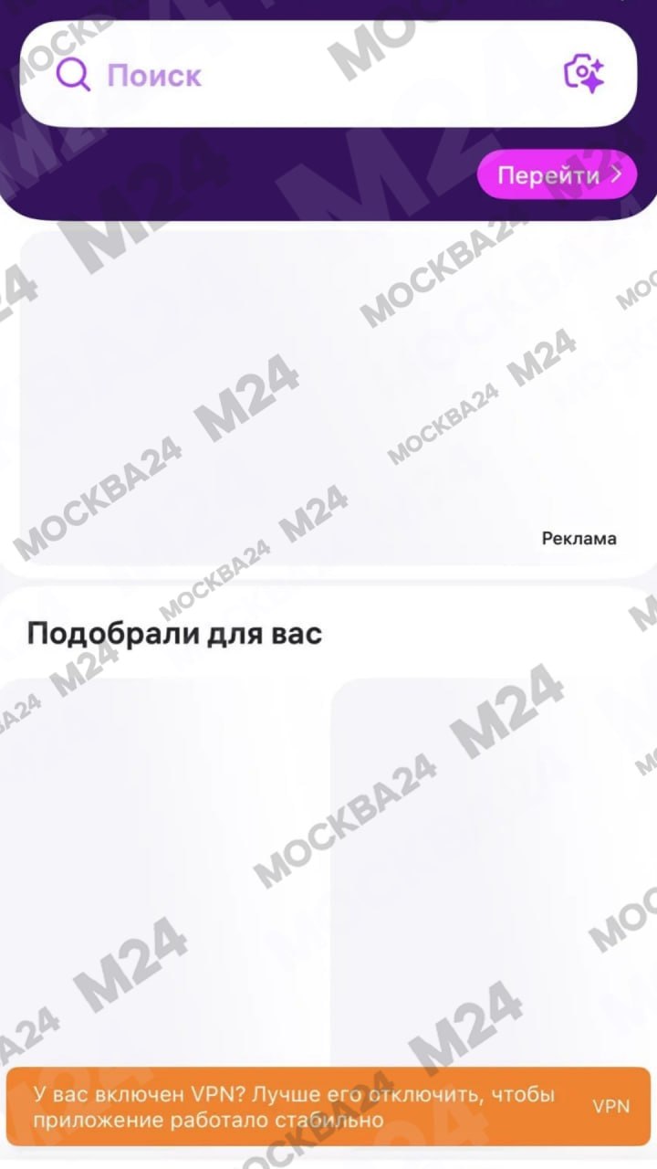 При попытке зайти в приложение с активным подключением появляется плашка: «У вас включён VPN». Доступ при этом ограничивается, или сервис вовсе перестаёт работать.