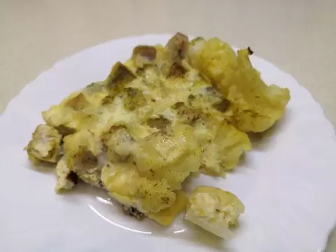 3. Посолите, приправьте по вкусу (например, куркумой и хмели-сунели) и подготовьте заливку: смешайте сметану, яйца и натертый сыр. Получившуюся массу аккуратно распределите по запеканке. Запекайте в духовке: 20 минут под фольгой и 20 минут без нее при температуре 180 °C.