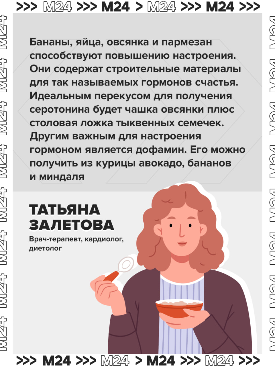 Гормоны радости действительно связаны с тем, что вы едите. Например, серотонин дают твёрдые сыры, индейка и семена тыквы. А недостаток дофамина можно восполнить, съев творог, курицу, авокадо, бананы и миндаль, рассказала «Москве 24» врач-терапевт и диетолог Татьяна Залетова.