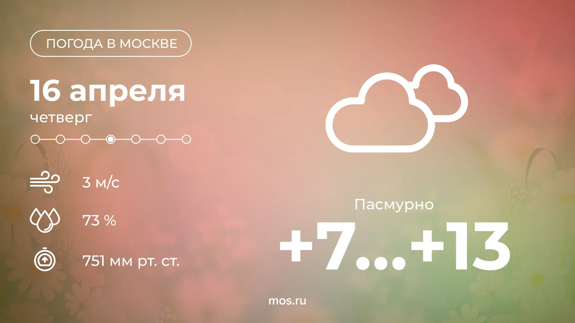Доброе утро! Сегодня в столице будет пасмурно, во второй половине дня местами возможен дождь. Не забудьте взять с собой зонтик!
