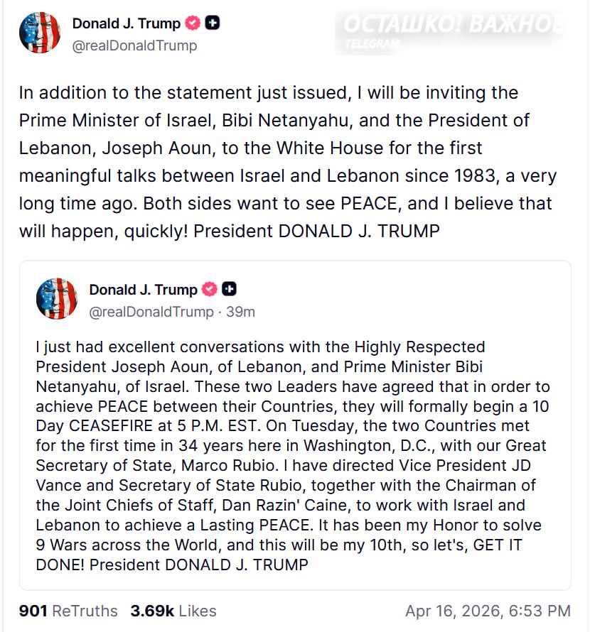 «Я только что провёл превосходные беседы Президентом Ливана Джозефом Ауном и Премьер-министром Израиля Биби Нетаньяху. Эти два лидера договорились о том, что ради достижения мира они официально объявят о начале 10-дневного прекращения огня».