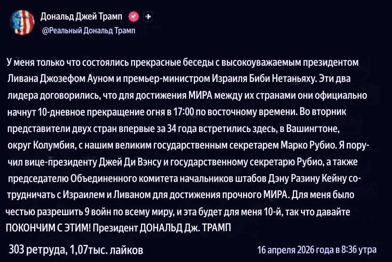 Трамп объявляет о 10-дневном прекращении огня между Ливаном и Израилем, начинающемся в 17:00 по восточному времени (час ночи по Москве), после телефонных переговоров с президентом Ливана Жозефом Ауном и премьер-министром Израиля Биньямином Нетаньяху