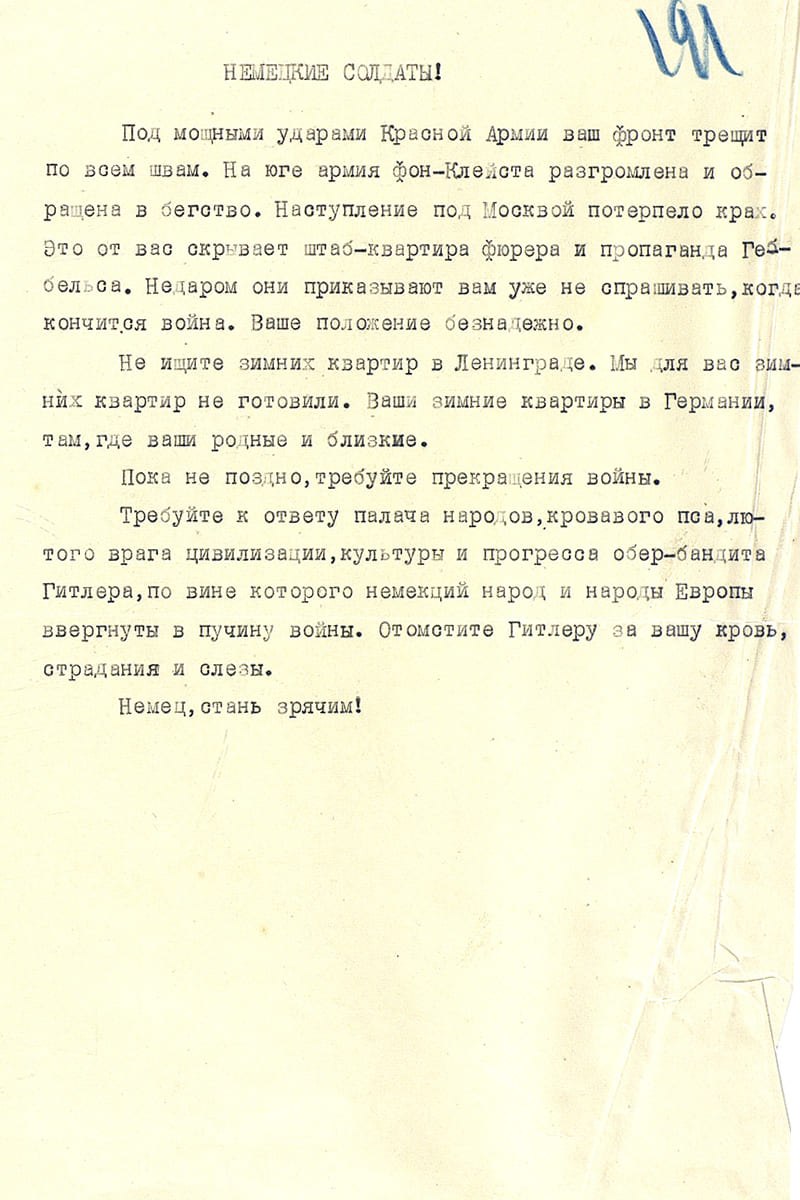 "Немецкие солдаты! Под мощными ударами Красной Армии ваш фронт трещит по всем швам. На юге армия фон Клейста разгромлена и обращена в бегство. Наступление под Москвой потерпело крах. Это от вас скрывает штаб-квартира фюрера и пропаганда Геббельса. Недаром они приказывают вам уже не спрашивать, когда кончится война. Ваше положение безнадежно. Не ищите зимних квартир в Ленинграде. Мы для вас зимних квартир не готовили. Ваши зимние квартиры в Германии, где ваши родные и близкие".