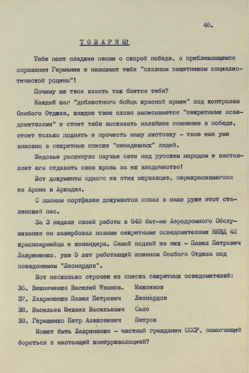 "Товарищ! Тебе поют сладкие песни о скорой победе, о приближающемся поражении Германии и называют тебя «славным защитником социалистической родины»! Почему же твоя власть так боится тебя? Каждый шаг «доблестного бойца красной армии» под контролем Особого отдела, каждое твое слово записывается… Жидовье раскинуло паучьи сети над русским народом и заставляет его отдавать свою кровь за их владычество… Германская оборона по-прежнему крепка. О ее гибкость разбиваются все советские удары. "