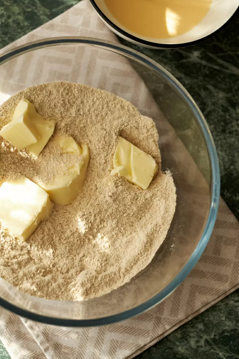 2. В глубокой чаше объединить оба вида муки, сахар и щепотку соли. Ввести мягкое сливочное масло и перетереть все в крошку. После этого добавить желтково-сливочную смесь и замесить тесто.