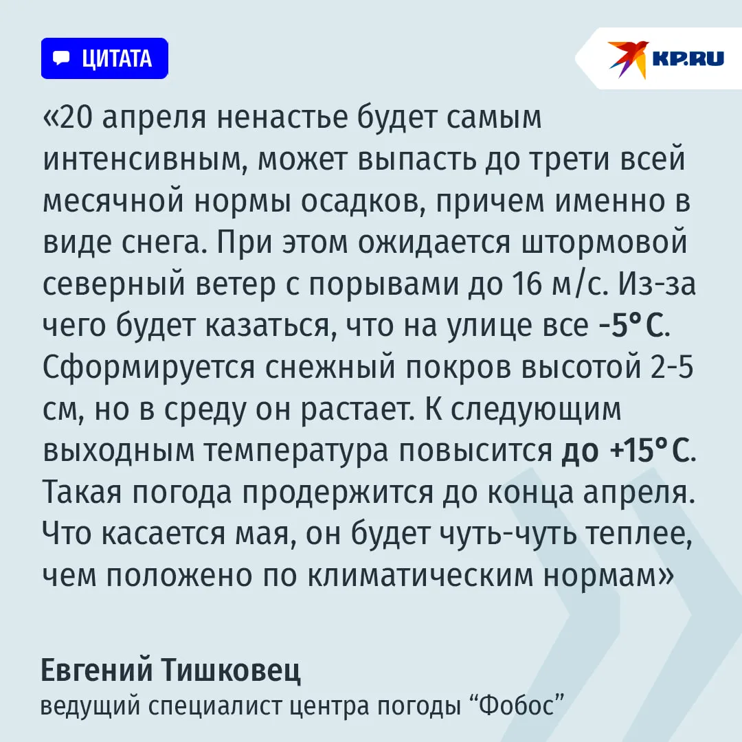 В воскресенье в центр России прорвется ледяной воздух из Арктики. И в течение трех суток (до вторника, 21 апреля) в столице не по сезону холодно и промозгло. По ночам в Подмосковье возможны заморозки до -1…-3°C, днем не выше +5…+7. И если в воскресенье с неба, вероятнее всего, будет лить дождь, смешанный со снежинками, то в понедельник и вторник - уже просто мокрый снег.