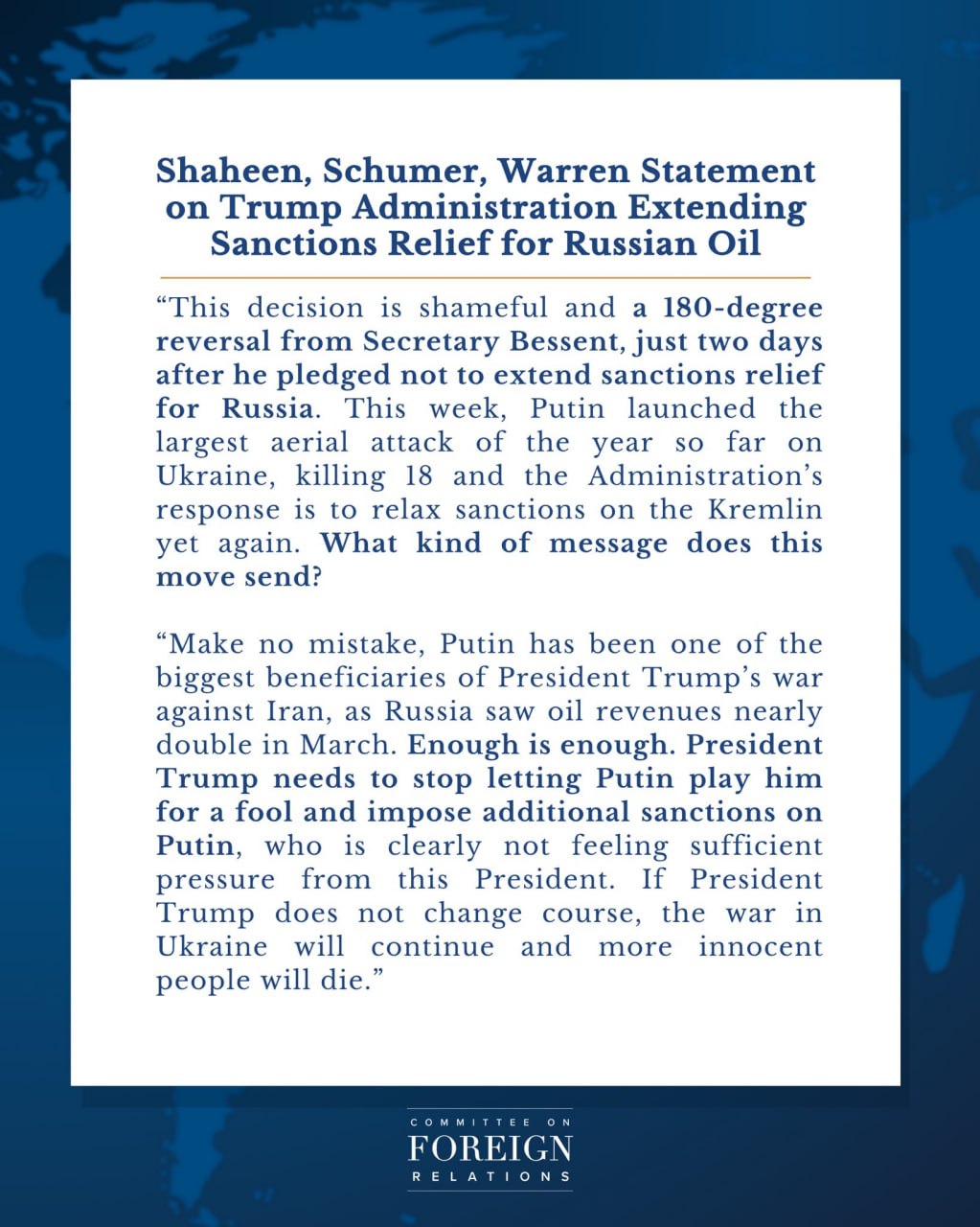 Демократы в Сенате тут же этим воспользовались — Джин Шахин, Элизабет Уоррен и лидер сенатского меньшинства Чак Шумер прямо назвали это решение позорным, подчеркнув, что Бессент фактически развернулся на 180 градусов за 48 часов.