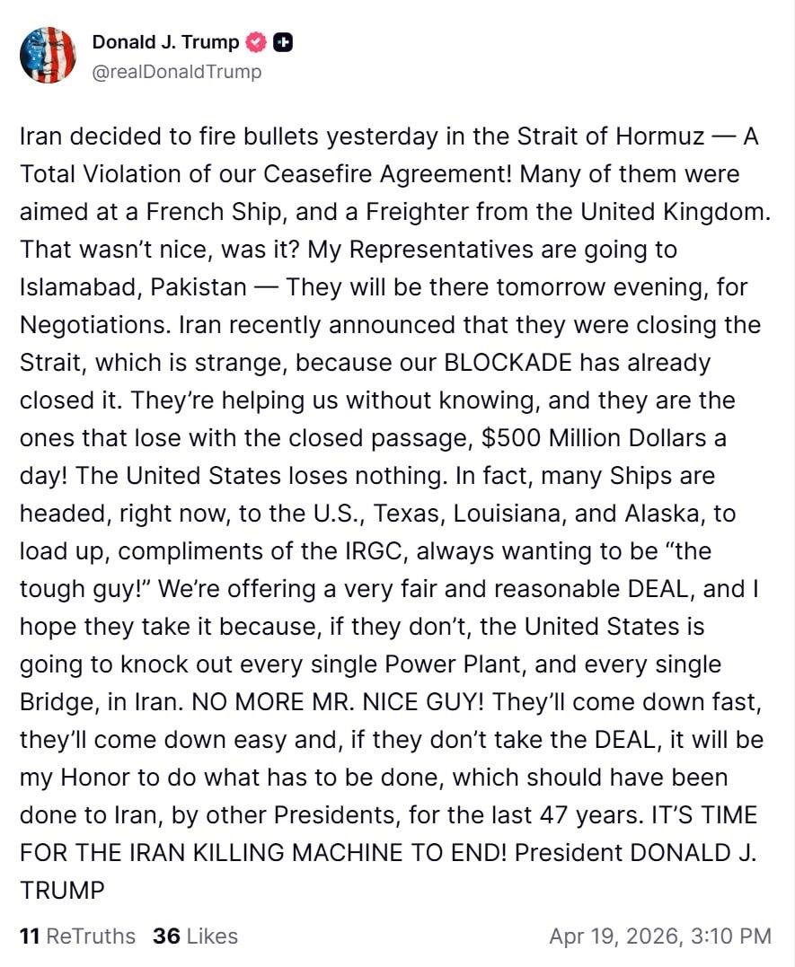 «Мы предлагаем честную и разумную сделку. Надеюсь, Иран её примет. Если нет, США уничтожат каждую электростанцию и каждый мост в Иране. Я больше не буду мистером "хороший парень"», — написал американский президент.