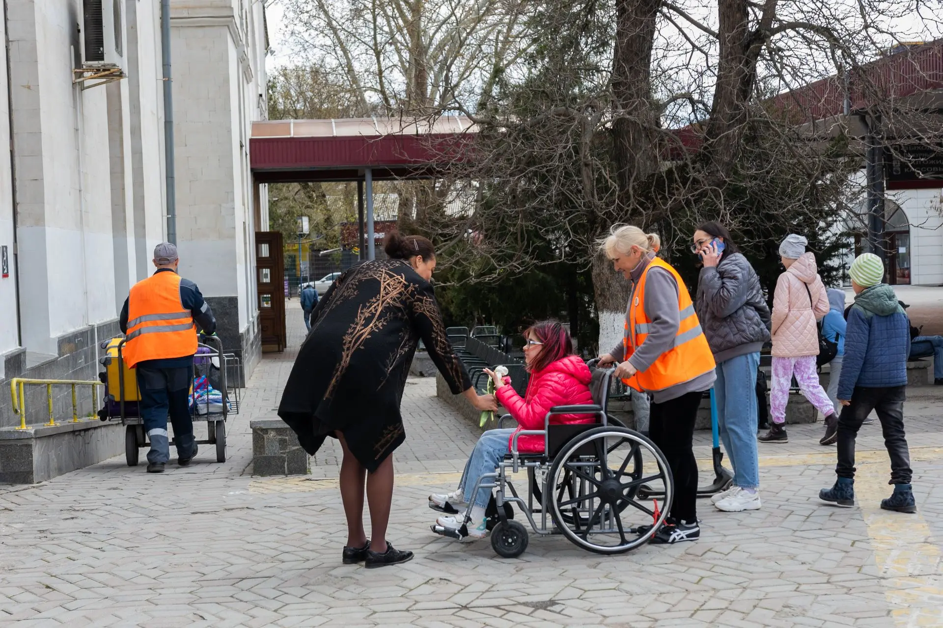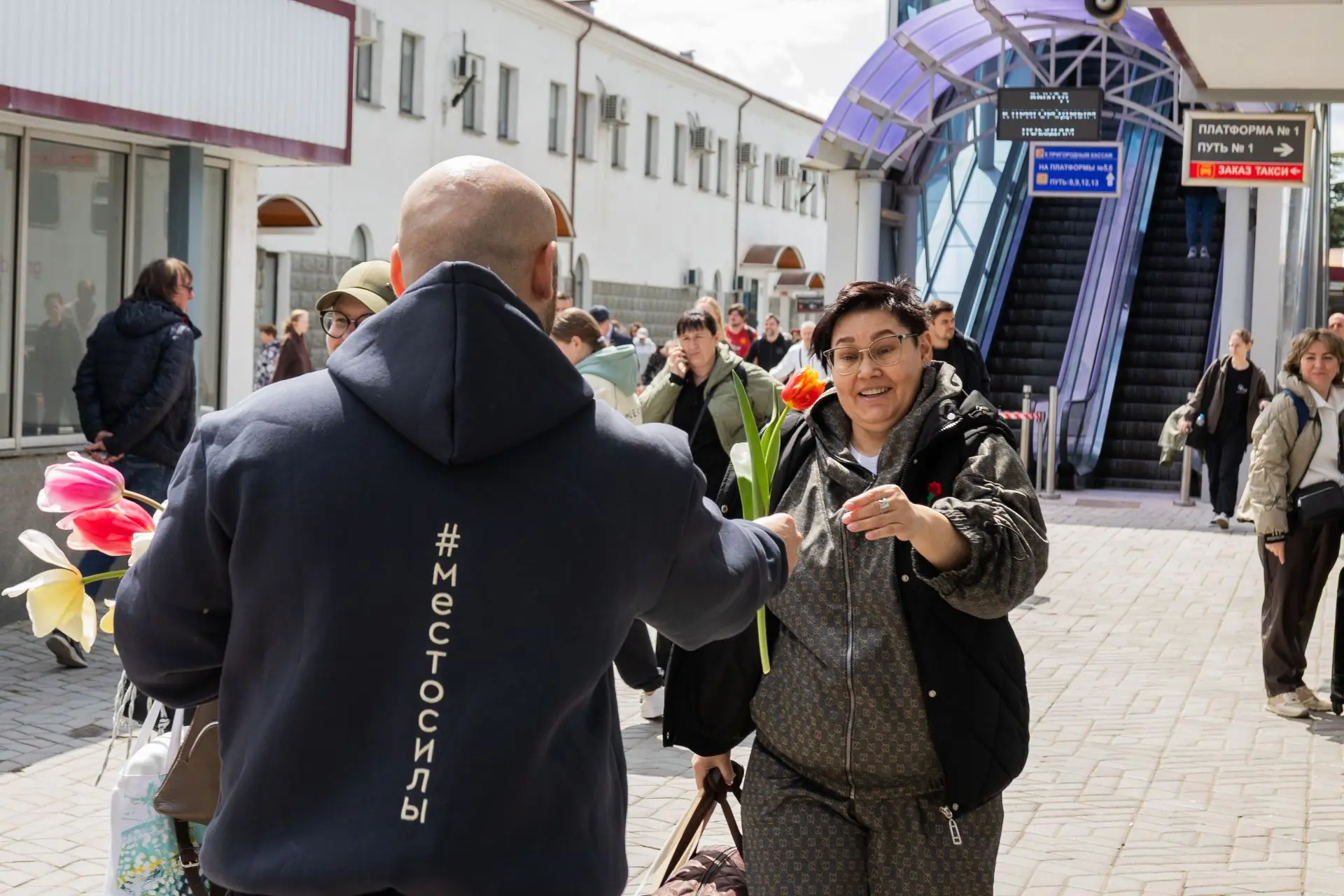 Сюрприз устроили на вокзале в Симферополе. Цветы вручали женщинам, девушкам и девочкам, прибывшим на поезде 028 «Таврия», следовавшем по маршруту Москва — Симферополь.