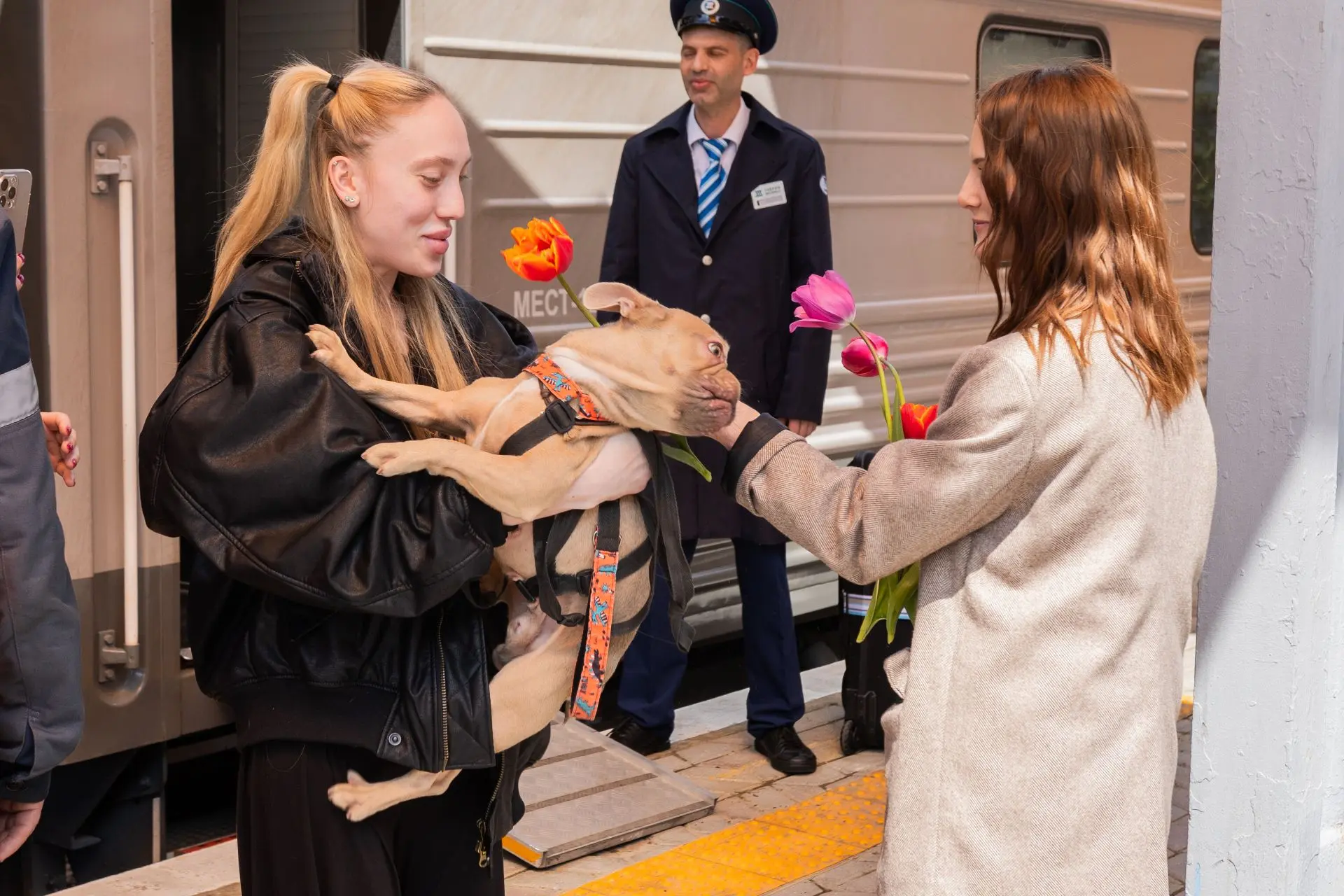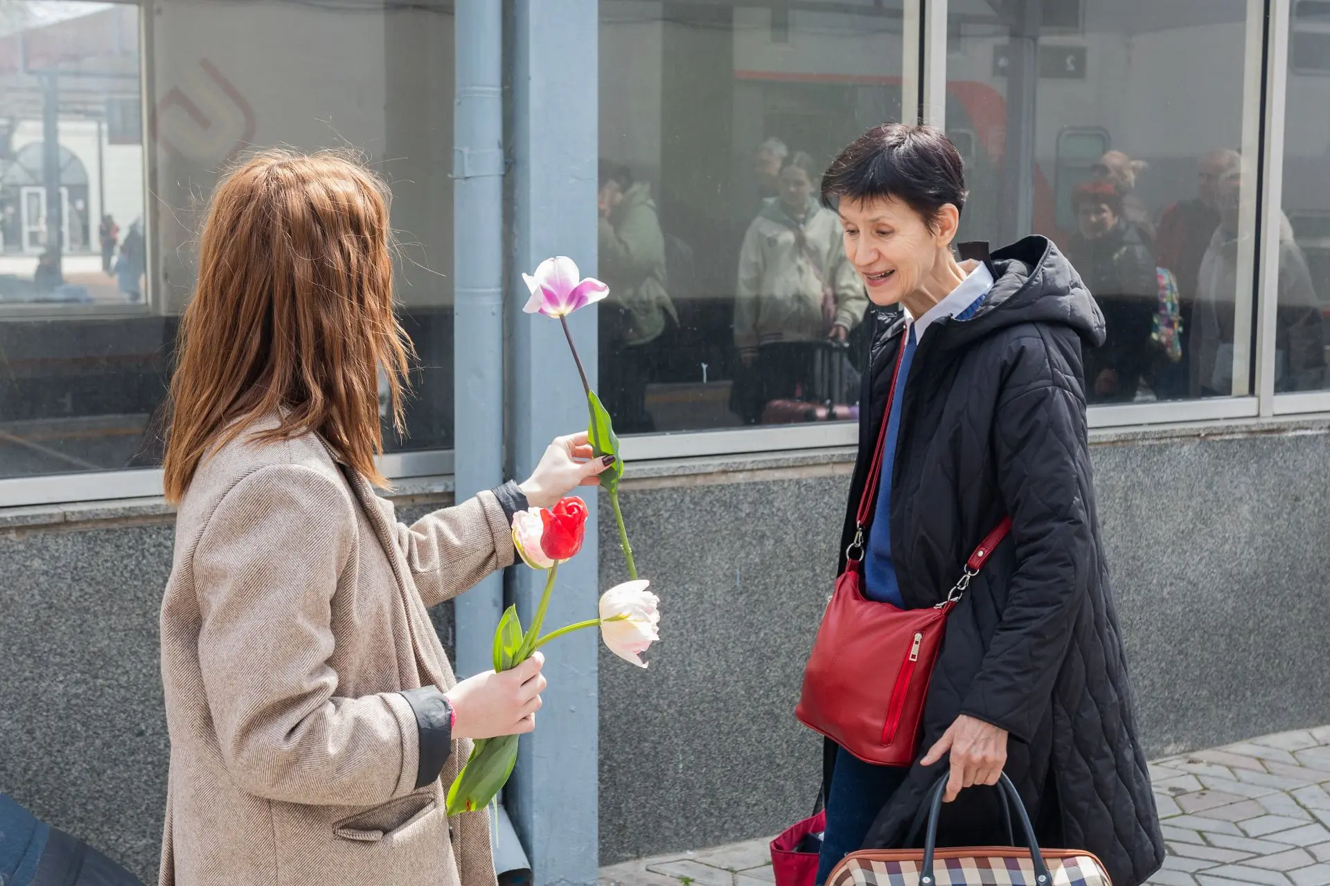 На Крымской железной дороге пассажиркам подарили сотни тюльпанов