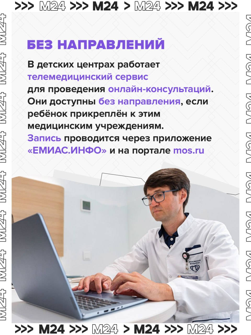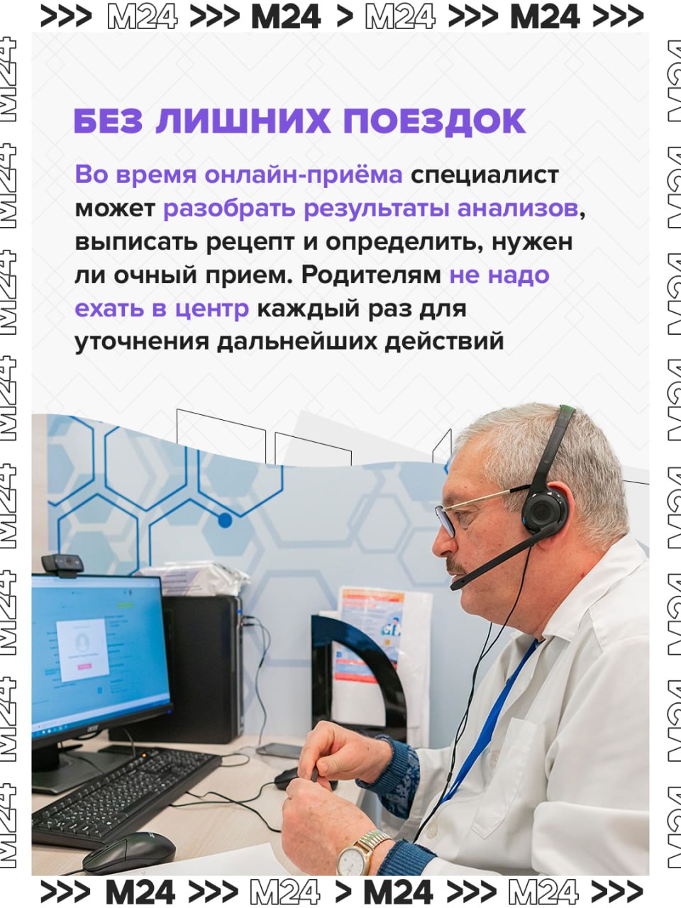 Главное удобство — телемедицинский сервис: родители могут записать ребёнка на онлайнконсультацию через приложение «ЕМИАС.ИНФО» или на портале правительства Москвы — без направления и лишних хлопот, сообщил Сергей Собянин.