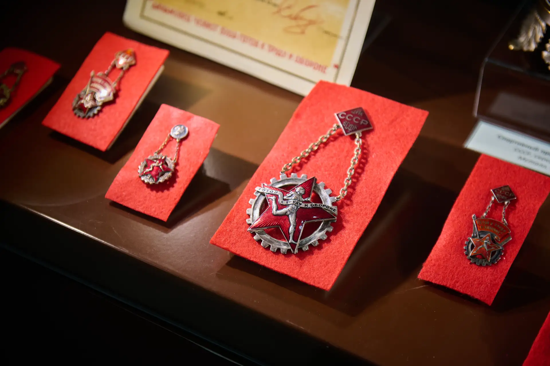 Отдельные разделы посвящены военной подготовке в предвоенные годы и современному этапу развития комплекса. Сквозной линией через всю экспозицию проходит эволюция дизайна знаков отличия — от первых до современных.