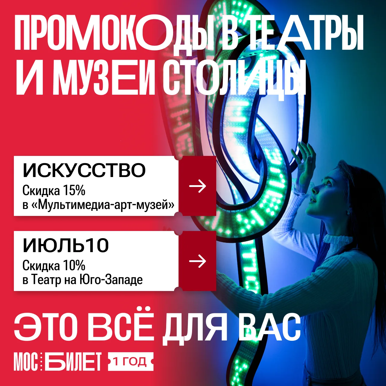Делимся актуальными промокодами. В честь дня рождения «Мосбилета» можно сходить в театр и музей со скидкой.