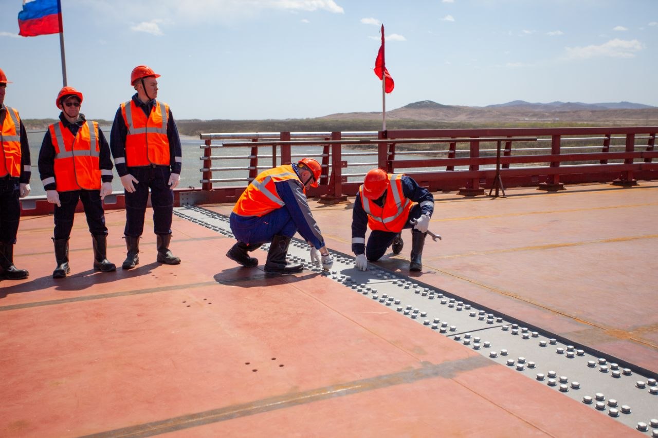 Символично, что команду на надвижку металлоконструкций во время церемонии стыковки строящегося моста через реку Туманную дал сопредседатель российско-корейской межправительственной комиссии по торгово-экономическому и научно-техническому сотрудничеству (министр природных ресурсов и экологии России) Александр Козлов: