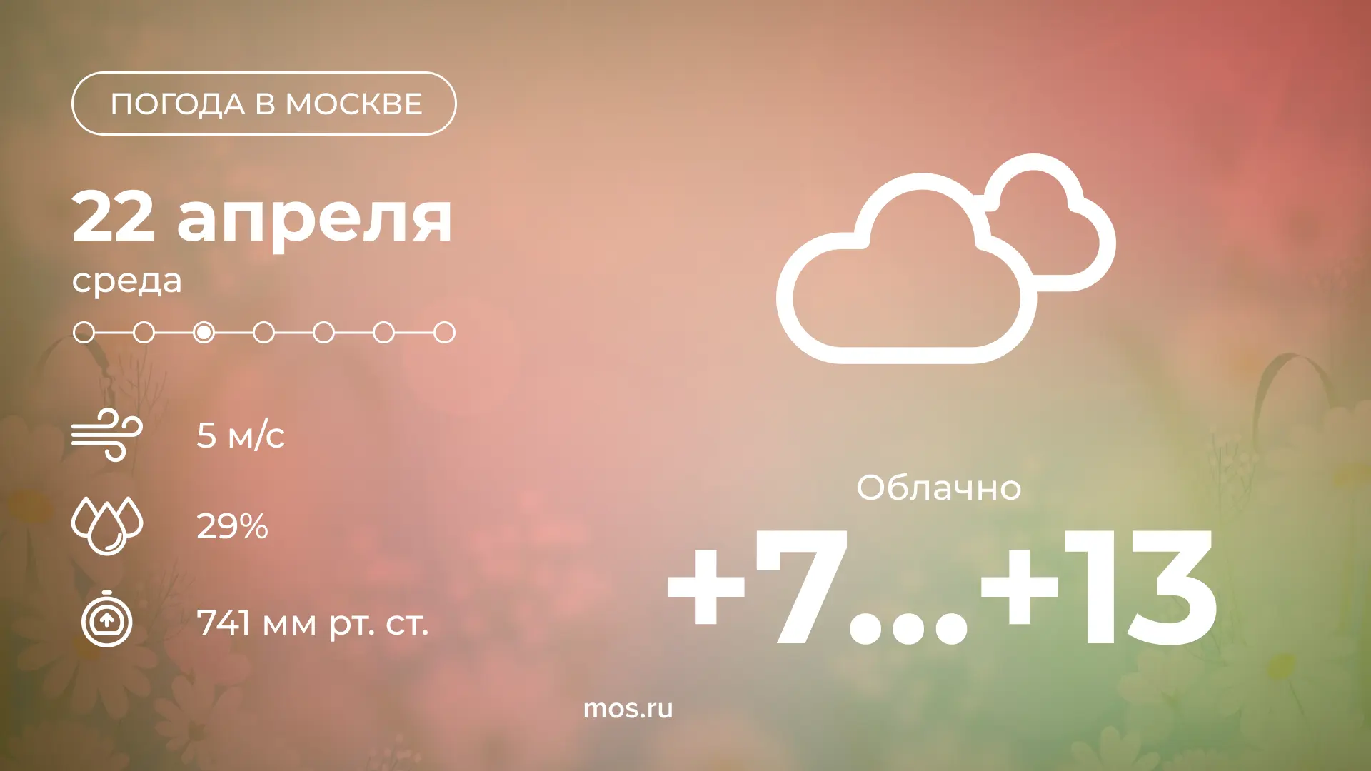 Доброе утро! Сегодня в столице будет облачно. Столбики термометров покажут от +7 до +13 °С.
