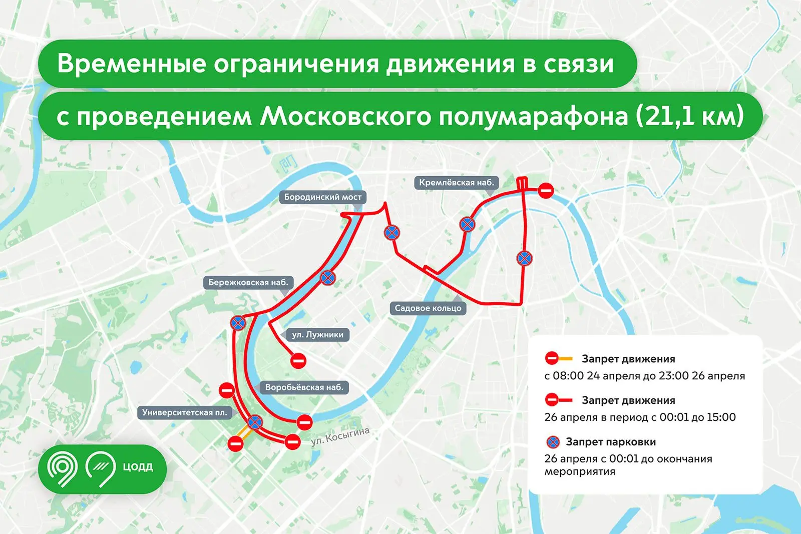 С 24 по 26 апреля на некоторых улицах ЦАО, ЗАО и ЮЗАО ограничат движение транспорта. Это связано с проведением Московского полумарафона. На перекрытых участках 25 и 26 апреля нельзя будет парковаться до завершения мероприятия. Подробнее — в инфографике и материале.