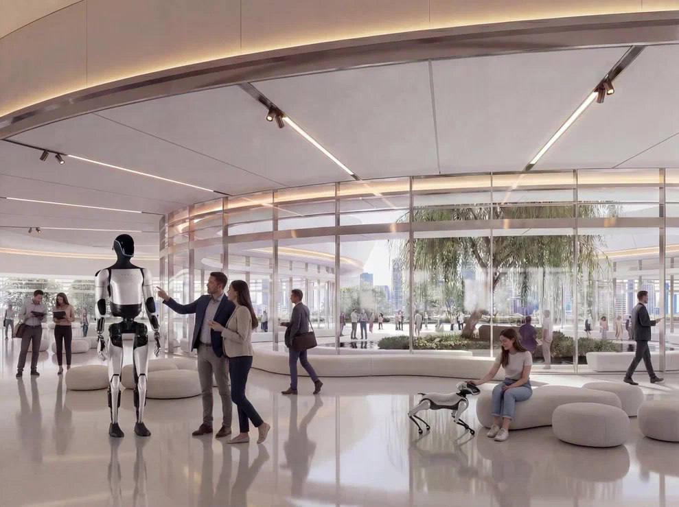 Здание в виде атома с прозрачным фасадом. Внутри — лаборатории, залы для мероприятий и современные инженерные системы. Вокруг — парк и зоны отдыха.