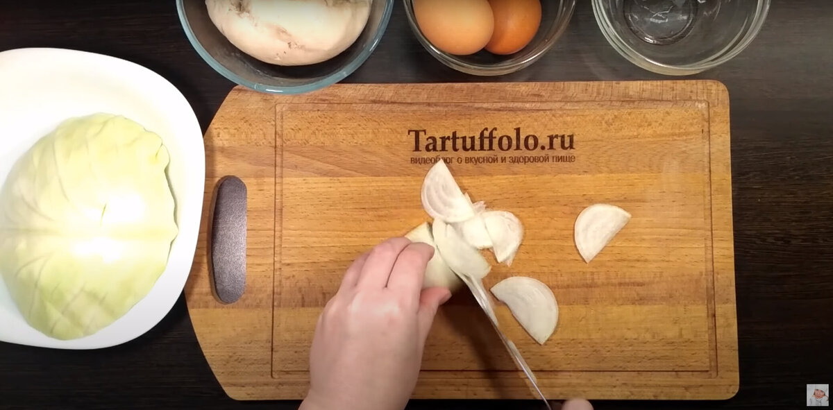 Затем займитесь капустой: нарежьте 300 г белокачанной капусты. Если она молодая, достаточно просто нарезать. Если же капуста зимних сортов, то немного посолите ее и помните руками, чтобы она выделила сок и стала более нежной.