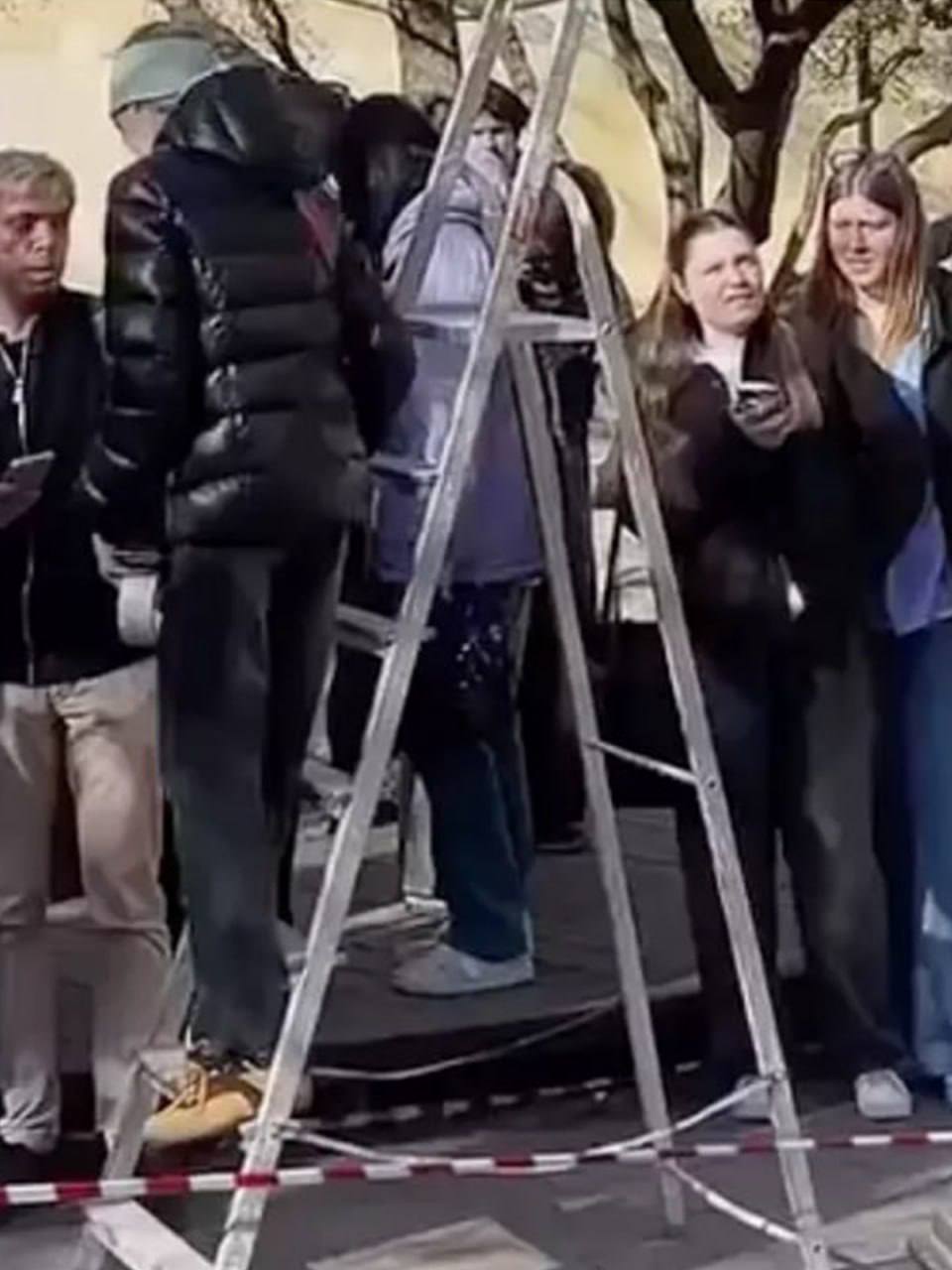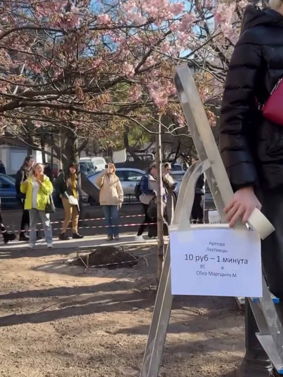 За красивое фото с сакурой придётся заплатить. Предприимчивая москвичка сдаёт в аренду стремянку у цветущего дерева в Саду Будущего.